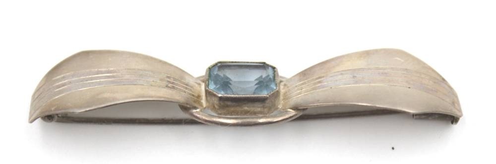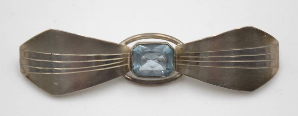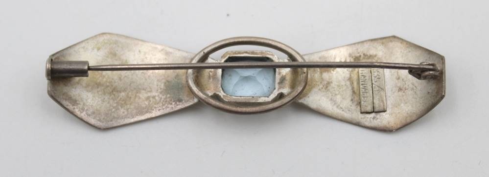 835er Silber-Brosche, Art-Déco, facc. hellblauer Stein, 6,1gr, L-6,2cm. [1]