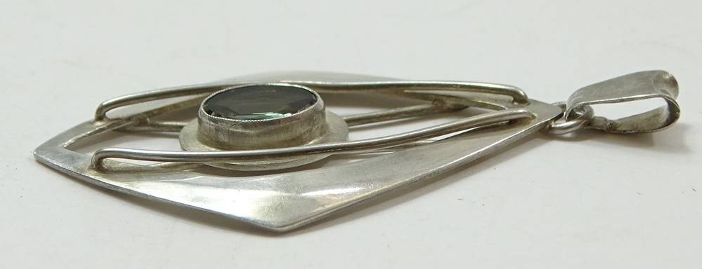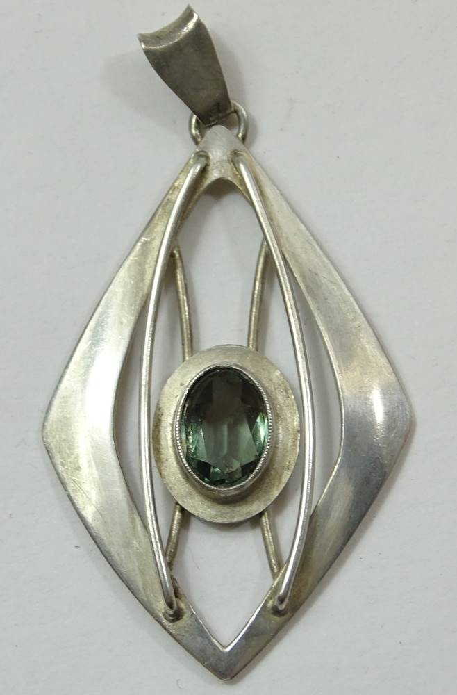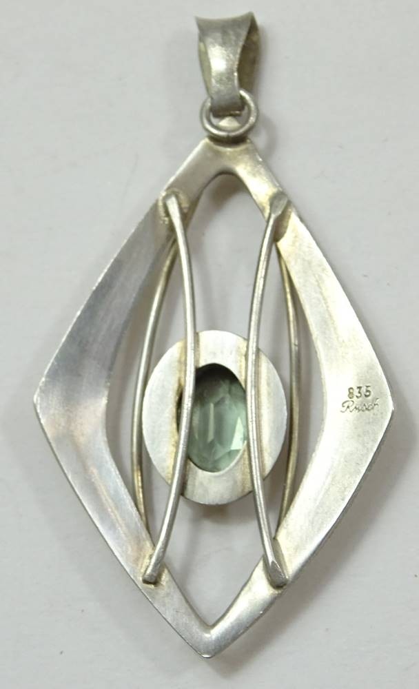 Art Deco-Anhänger, 835er-Silber, gemarkt "Rusch", mit grün-blauem Edelstein, L. 5,4 cm, 5 gr., mit Altersspuren, reinigungsbedürftig [1]