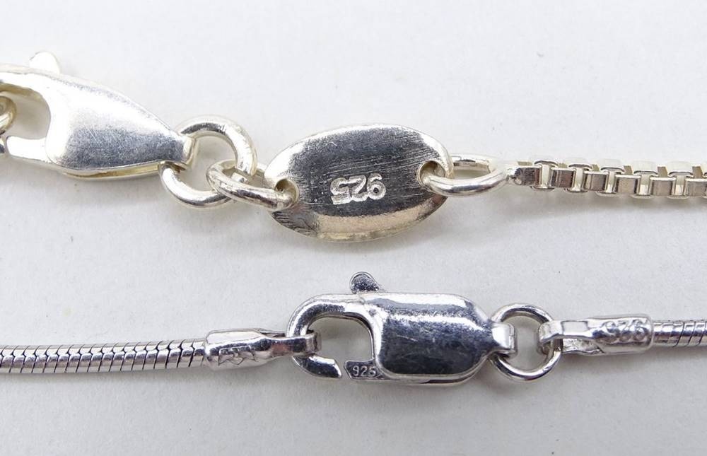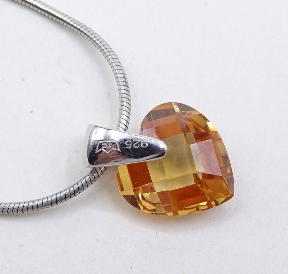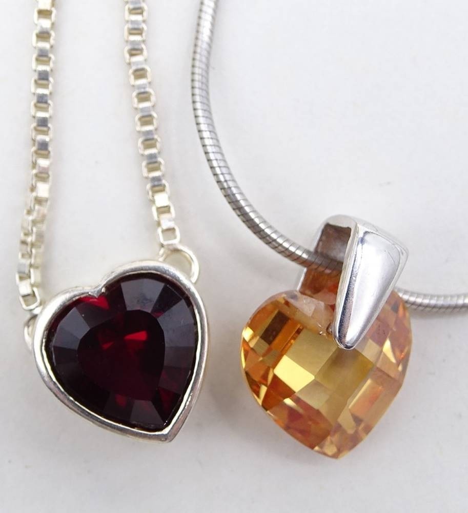 Collier und Kette mit Herzanhängern aus rotem bzw. orangefarbenem Schmuckstein, 925er-Silber, 1 x Esprit, L. 44, Schlangenkette an einer Stelle geknickt [1]