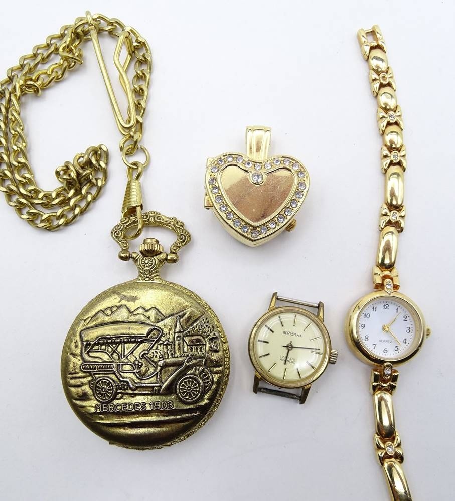4 div. goldfarbene Uhren, "Aquamar", "Bergana", 3 x Quartz, 1 x Handaufzug, Werk läuft, Ø 4,5 cm, 2 cm, 2,3 cm, Herz, 3 x 2,5 cm, Quartzwerke nicht geprüft. [1]