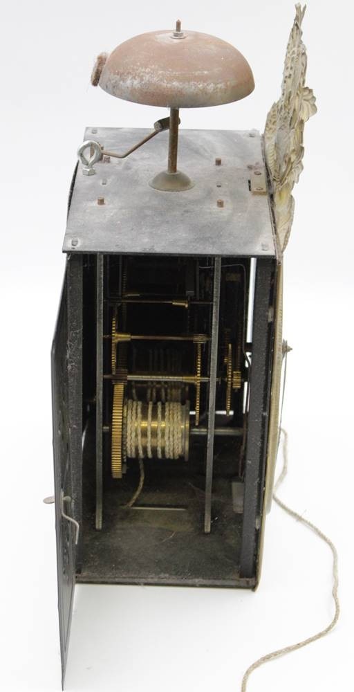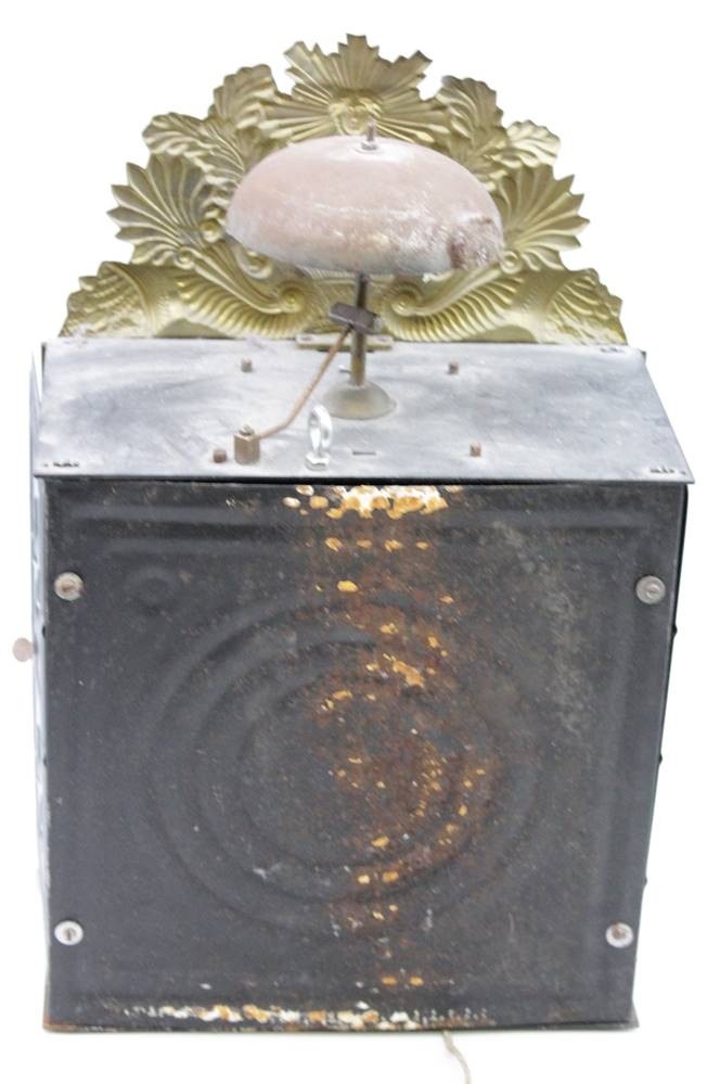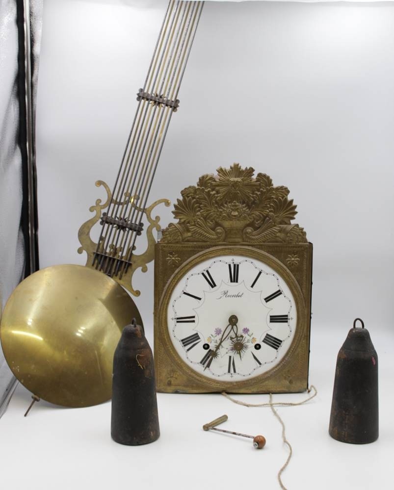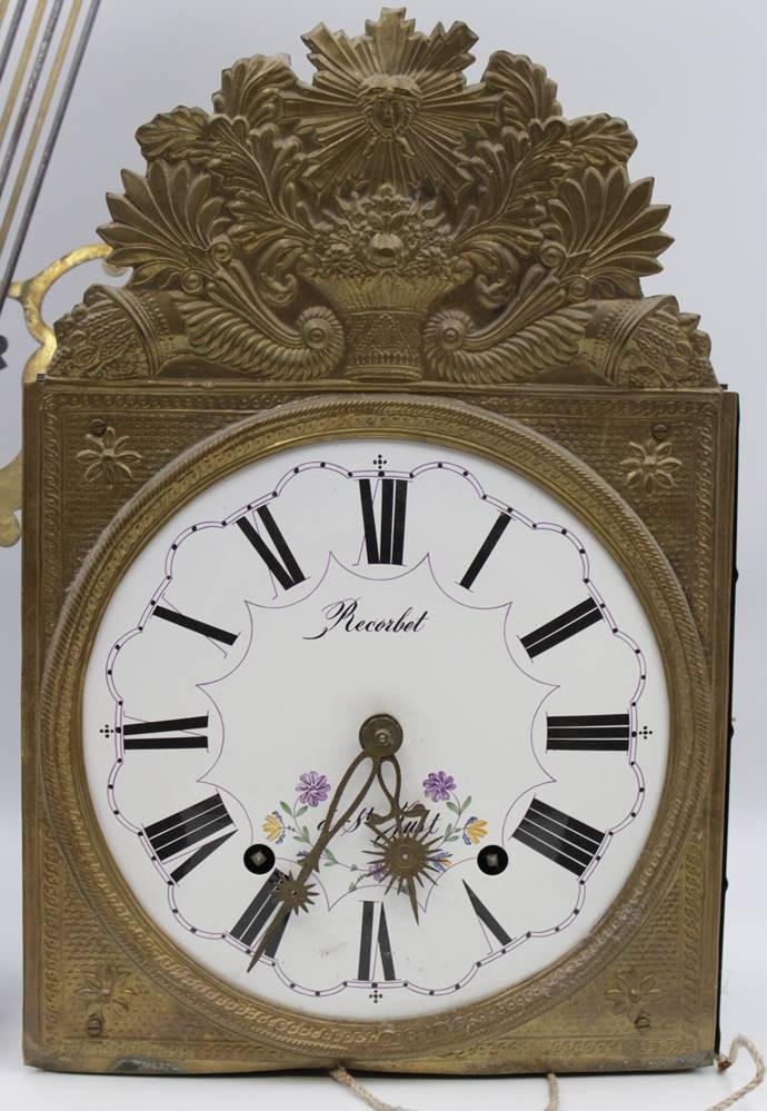 Comtoise Wanduhr, Frankreich 19. / 20. Jhd., leicht gewölbtes polychrom staffiertes Emailleziffernblatt, Lyra-Pendel, Uhr H-45cm B-28cm, Pendel L-103cm, Schlüssel anbei, Funktion nicht geprüft. [1]
