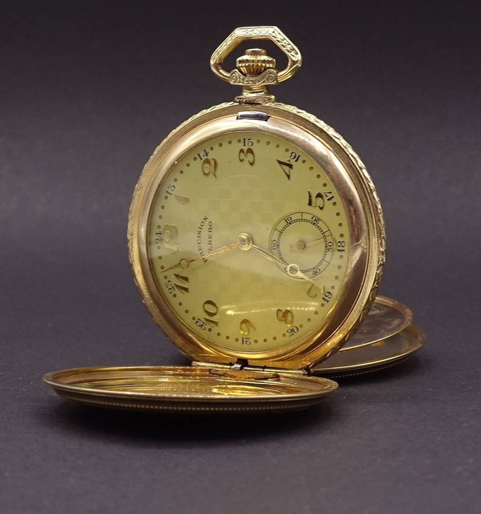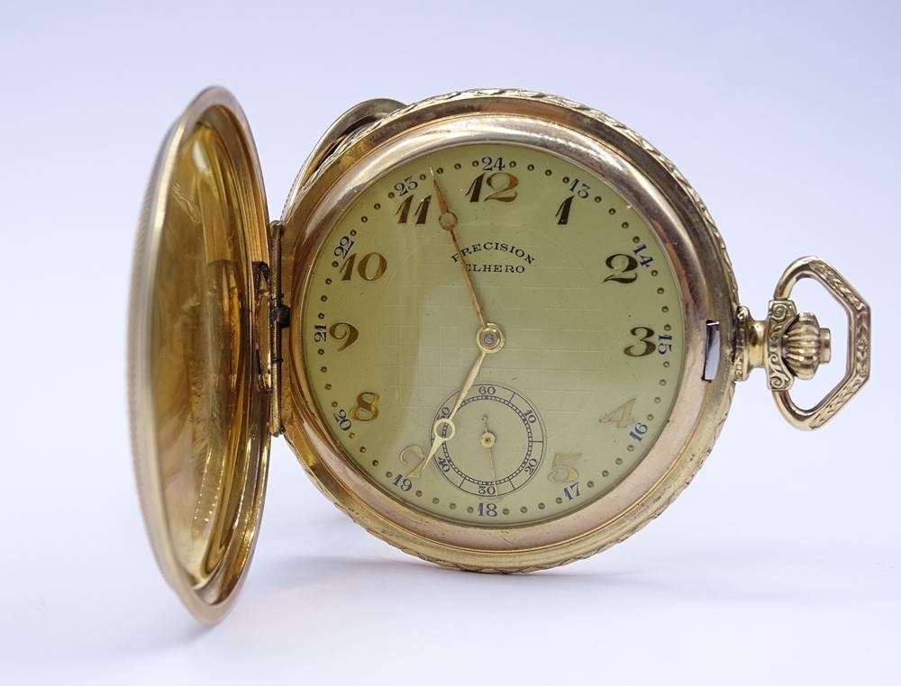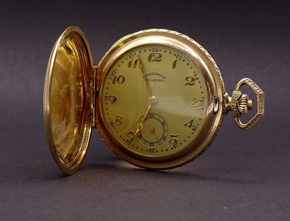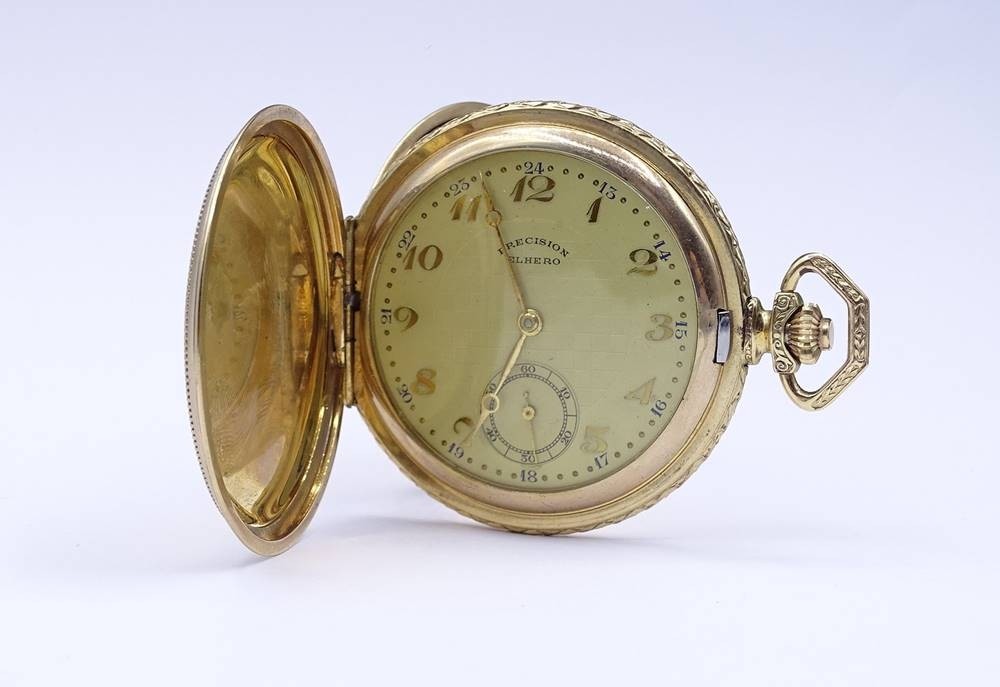 Herren Savonette Taschenuhr "Precision Elhero", mechanisch, Werk läuft, D. 52mm, goldfarbenes Gehäuse, in Etui und Staubbeutel [1]