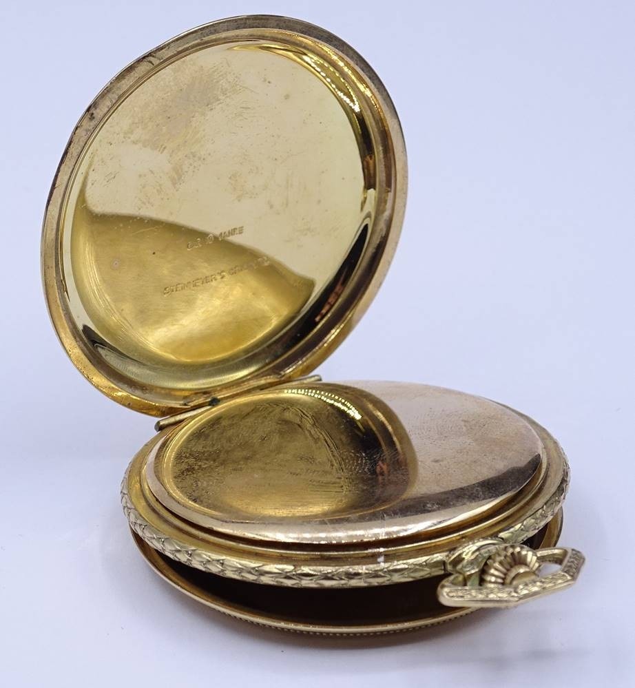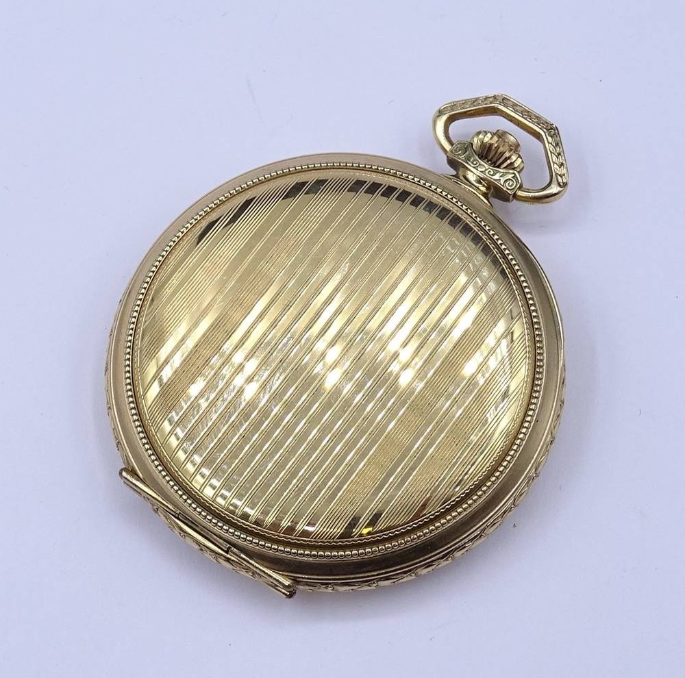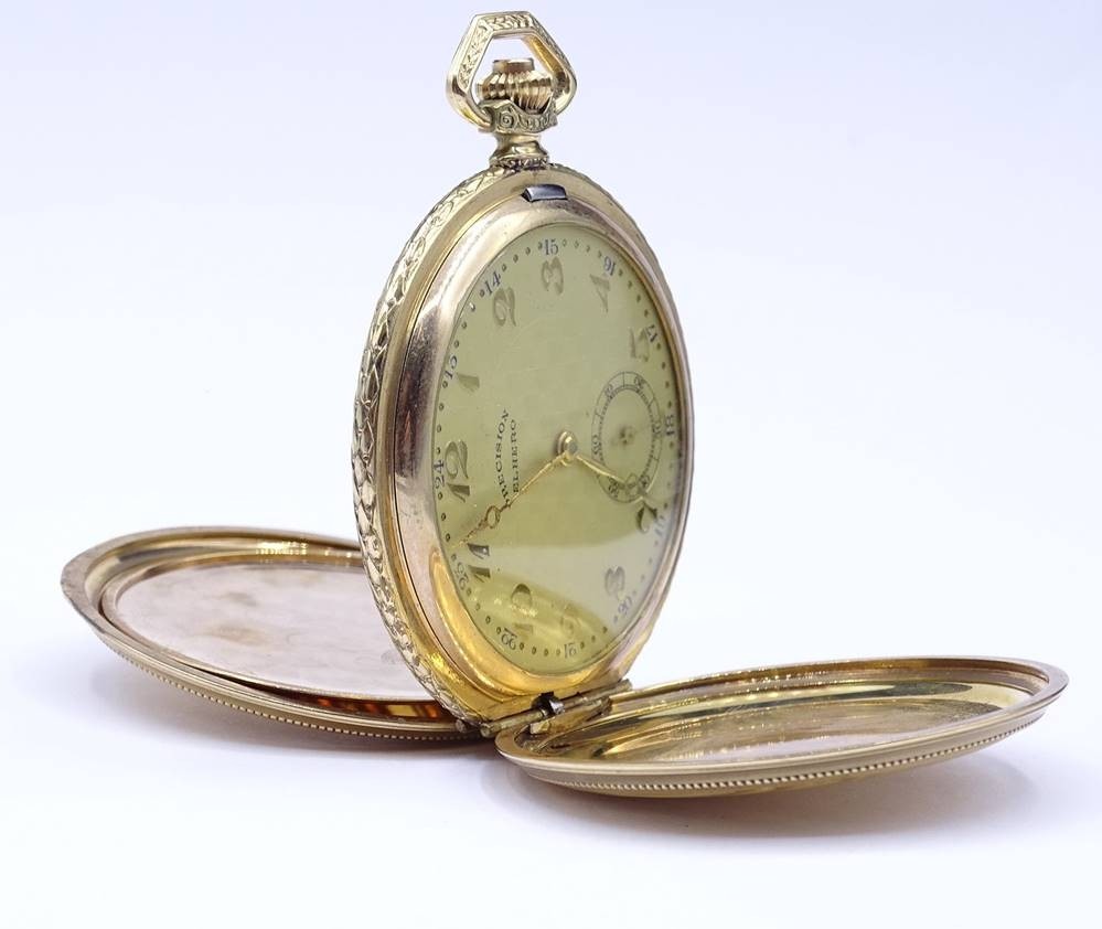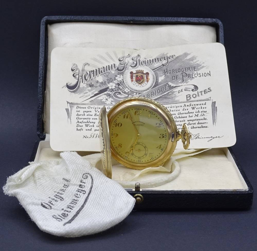 Herren Savonette Taschenuhr "Precision Elhero", mechanisch, Werk läuft, D. 52mm, goldfarbenes Gehäuse, in Etui und Staubbeutel [1]