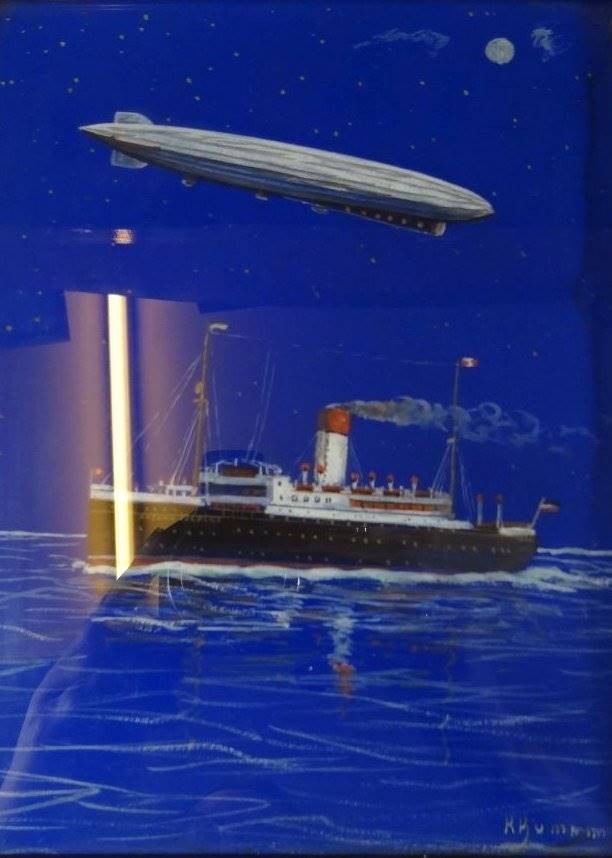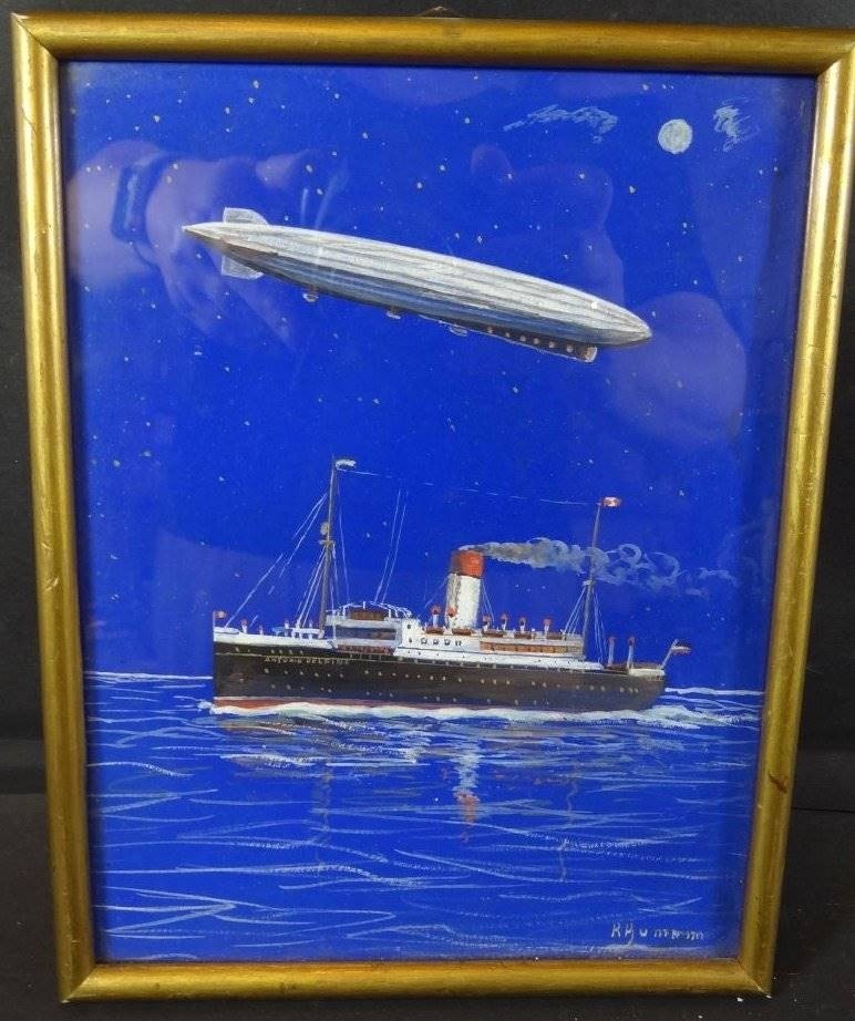 R. Rumann "Kombischiff Antonio Delfino" Reederei Hamburg-Süd unter Zeppelin, Aquarell, ger/Glas, RG 23x18 cm [1]