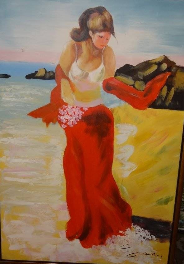unleserl. sign grosses Gemälde "Am Strand", Öl/Leinen, gerahmt, RG 94x64 cm [1]