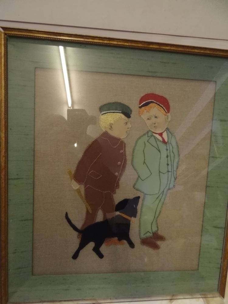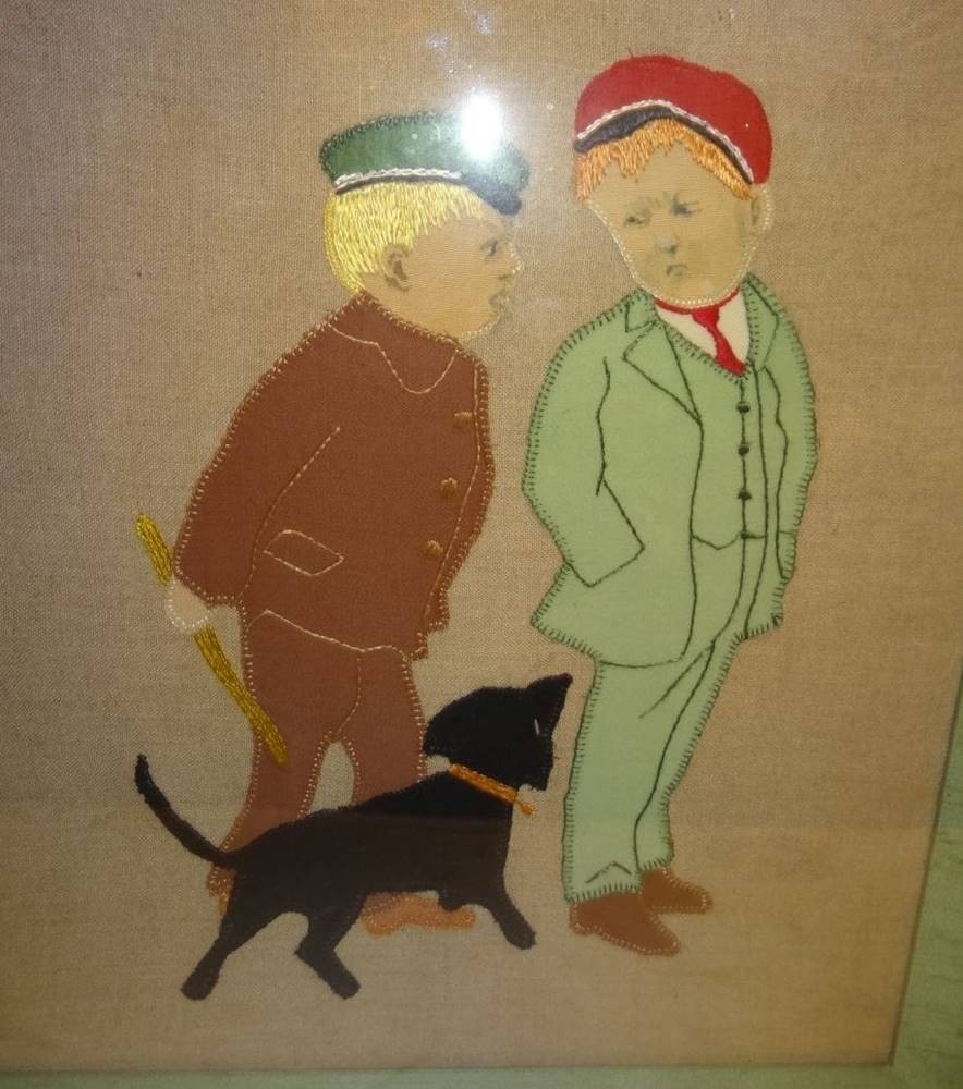 Losnummer 13009 - Stickbild "2 Studenten mit Hund" in Glasrahmen, 50x45 cm