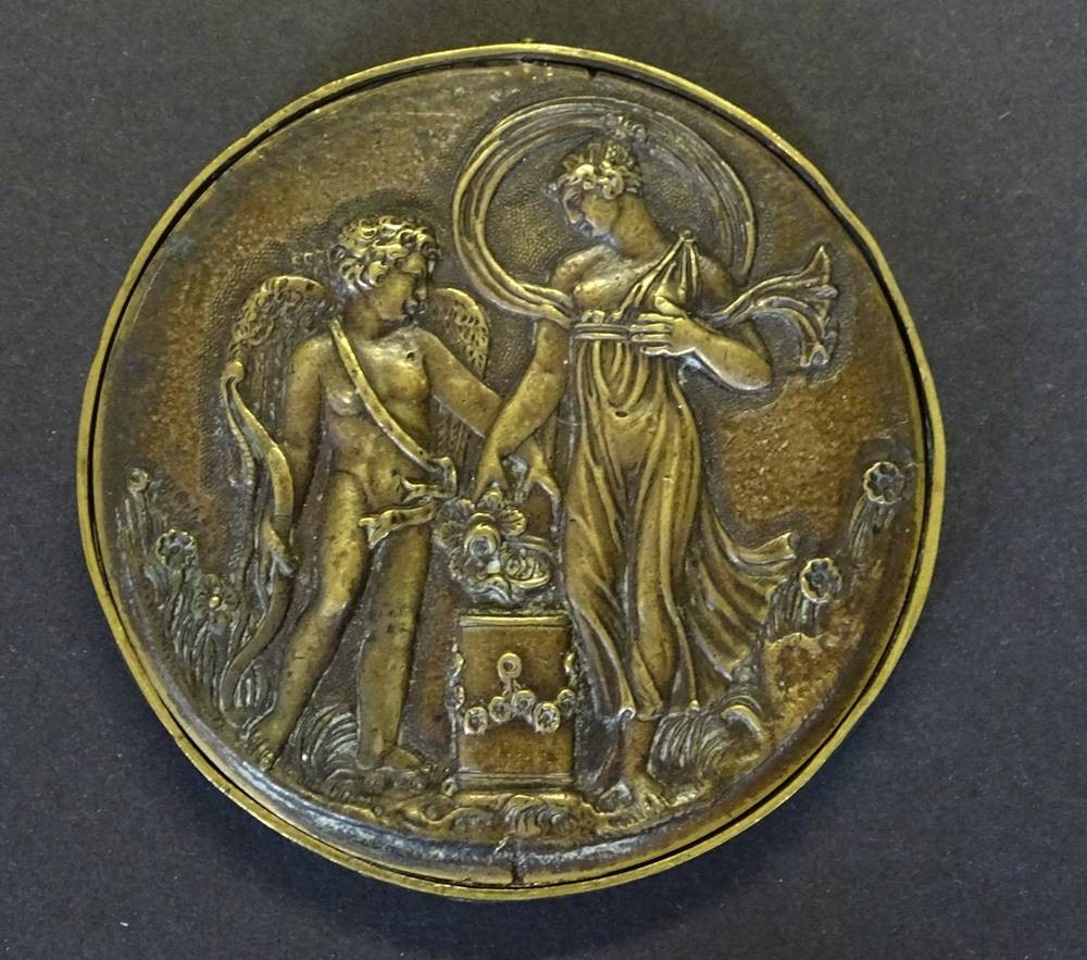 Teil einer Bronzemedaille mit Abbildung Eros und weiblicher Figur an Alter?, Innenseite gemarkt "TS", Ø 6,2 cm, Rahmen abnehmbar [1]