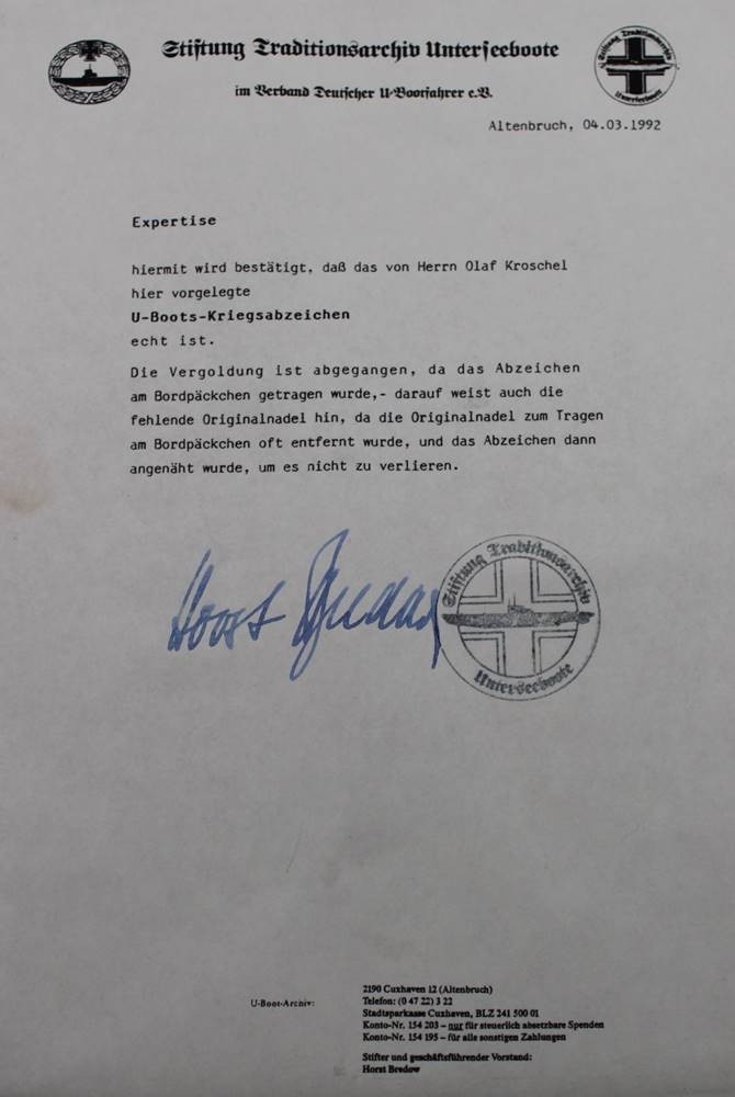 U-Boot-Kriegsabzeichen, 3. Reich, anbei Expertise, Nadelsystem erneuert [1]