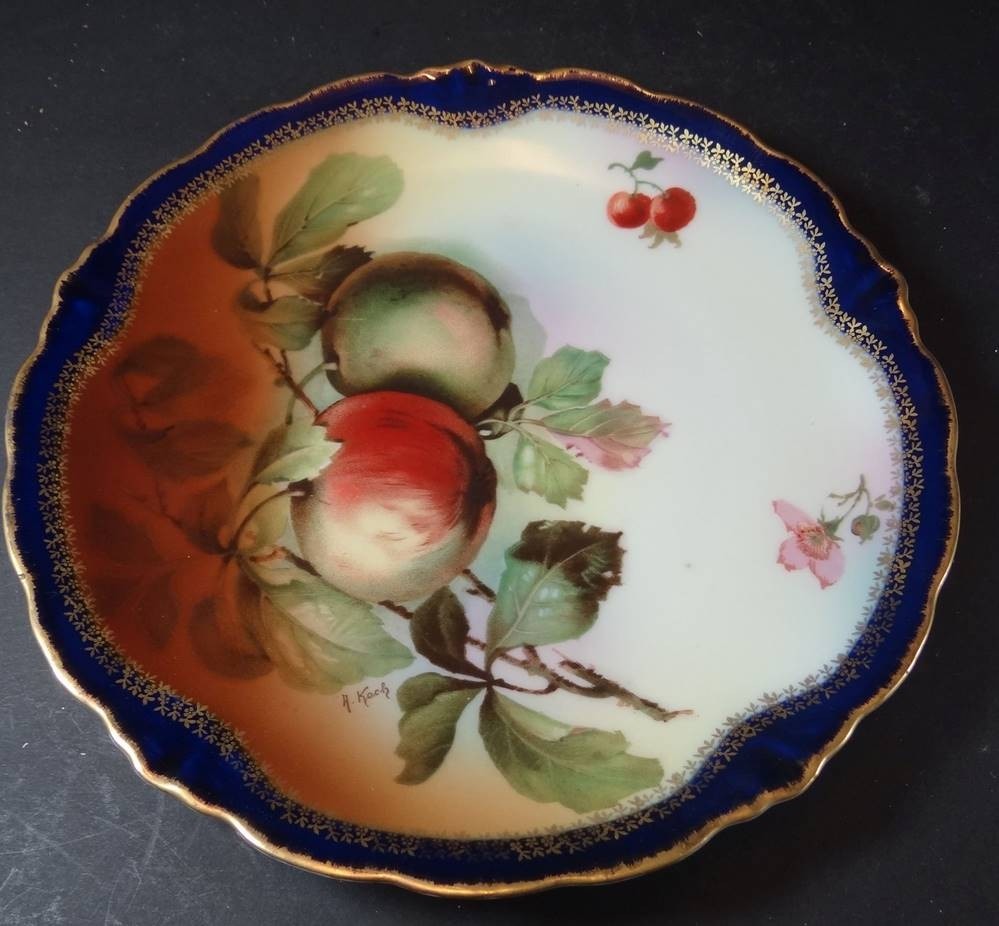 4x Obstteller J&C Malmaison mit polychromen Früchtedekor, A.Koch signiert, Kobaltrand, D-21 cm [1]