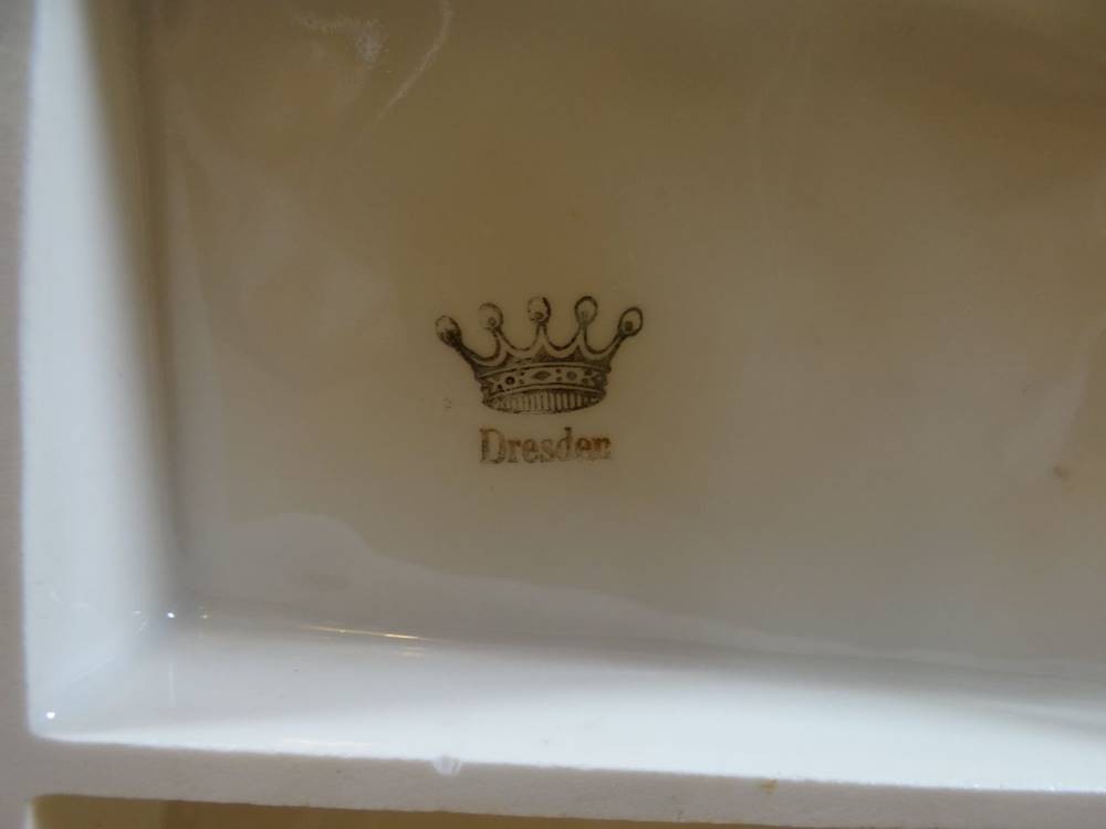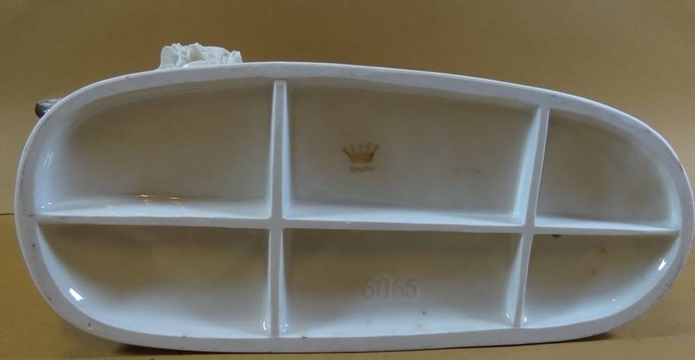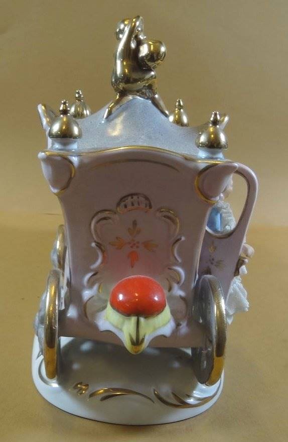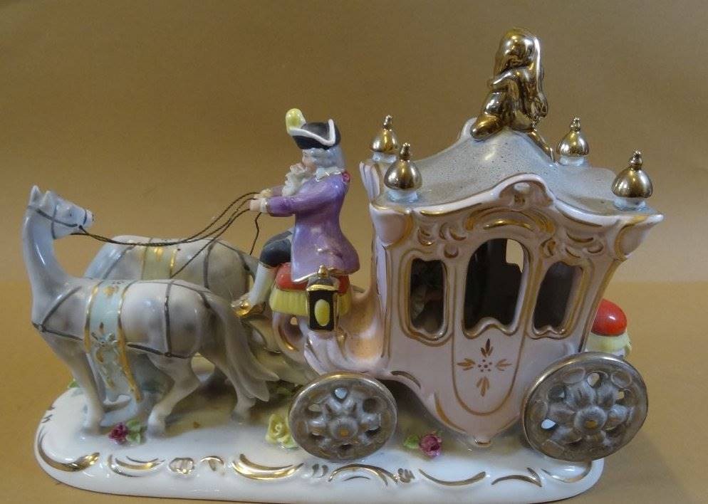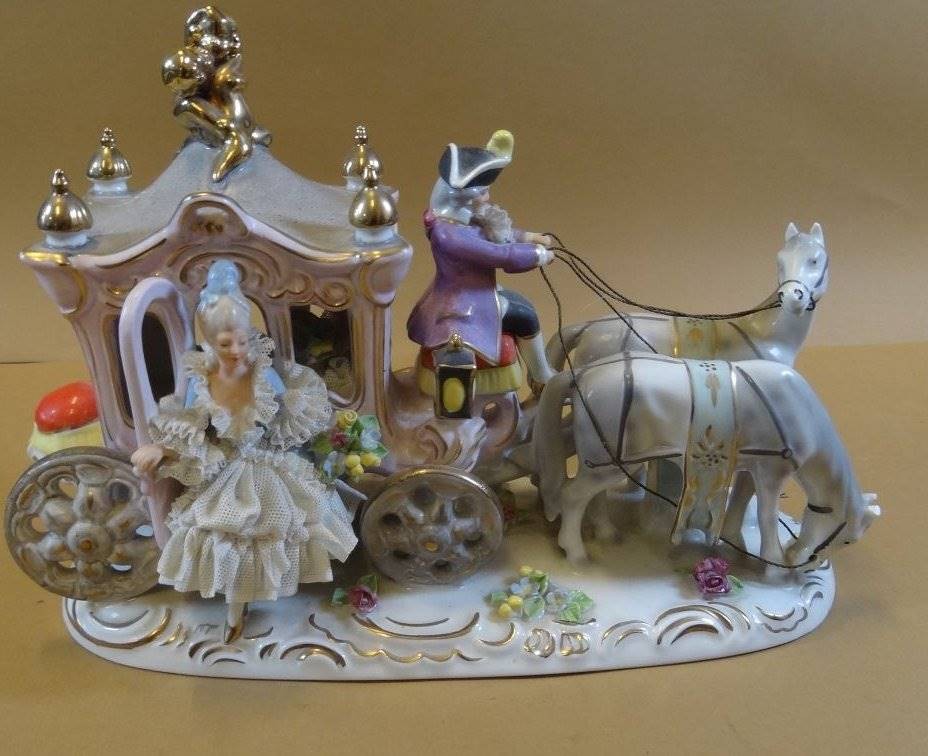 gr. Kutsche, "Dresden" bemalt, ein Ohr und Spitzenkleid beschädigt, H-19 cm, L-27 cm [1]