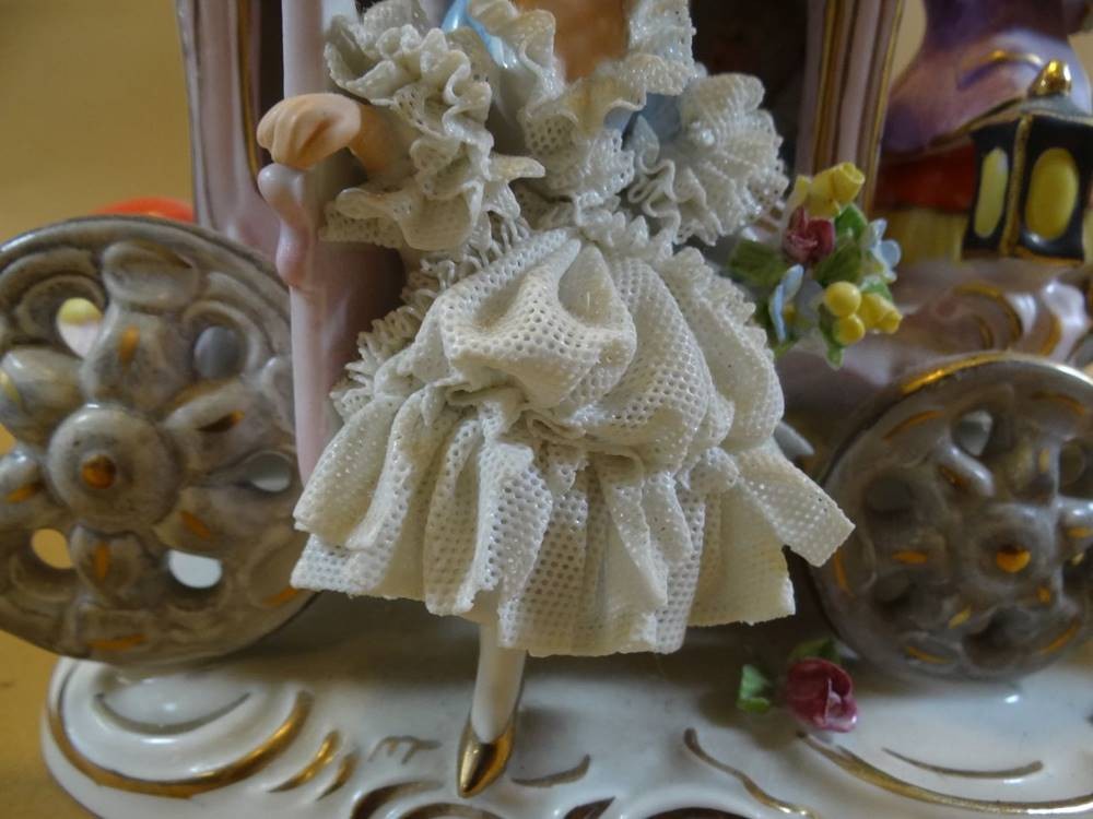 Losnummer 8183 - gr. Kutsche, "Dresden" bemalt, ein Ohr und Spitzenkleid beschädigt, H-19 cm, L-27 cm