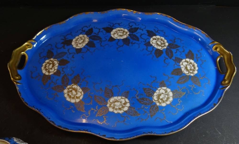 gr. Tete a Tete "Pirkenhammer" Tschechoslowakei, Mokka-Kern mit 4 Tassen, 2 U.T. auf grossen Tablett, gut erhalten, Zuckertopf, nur innen sichtbar, dünne Altrisse, Platte 43x31 cm,Kanne H-22 cm [1]