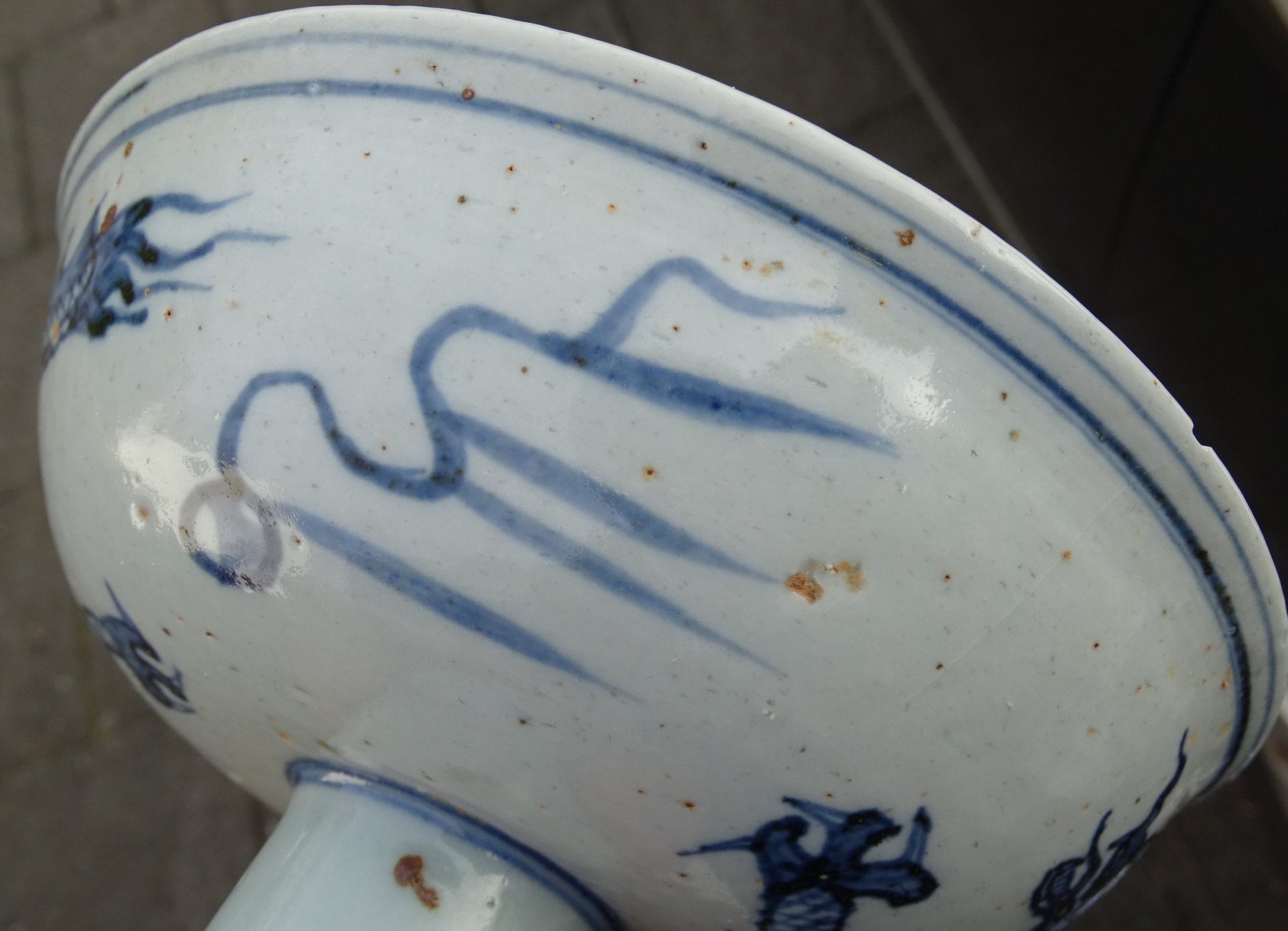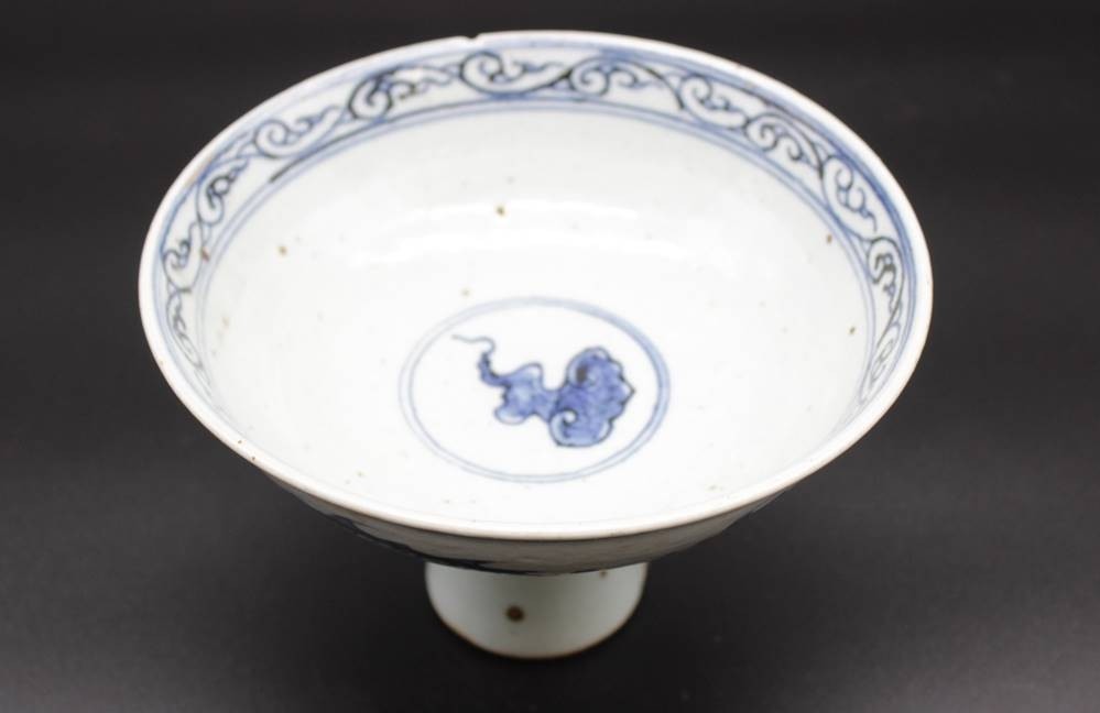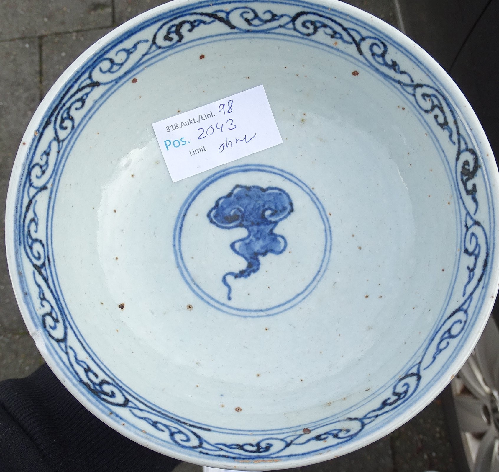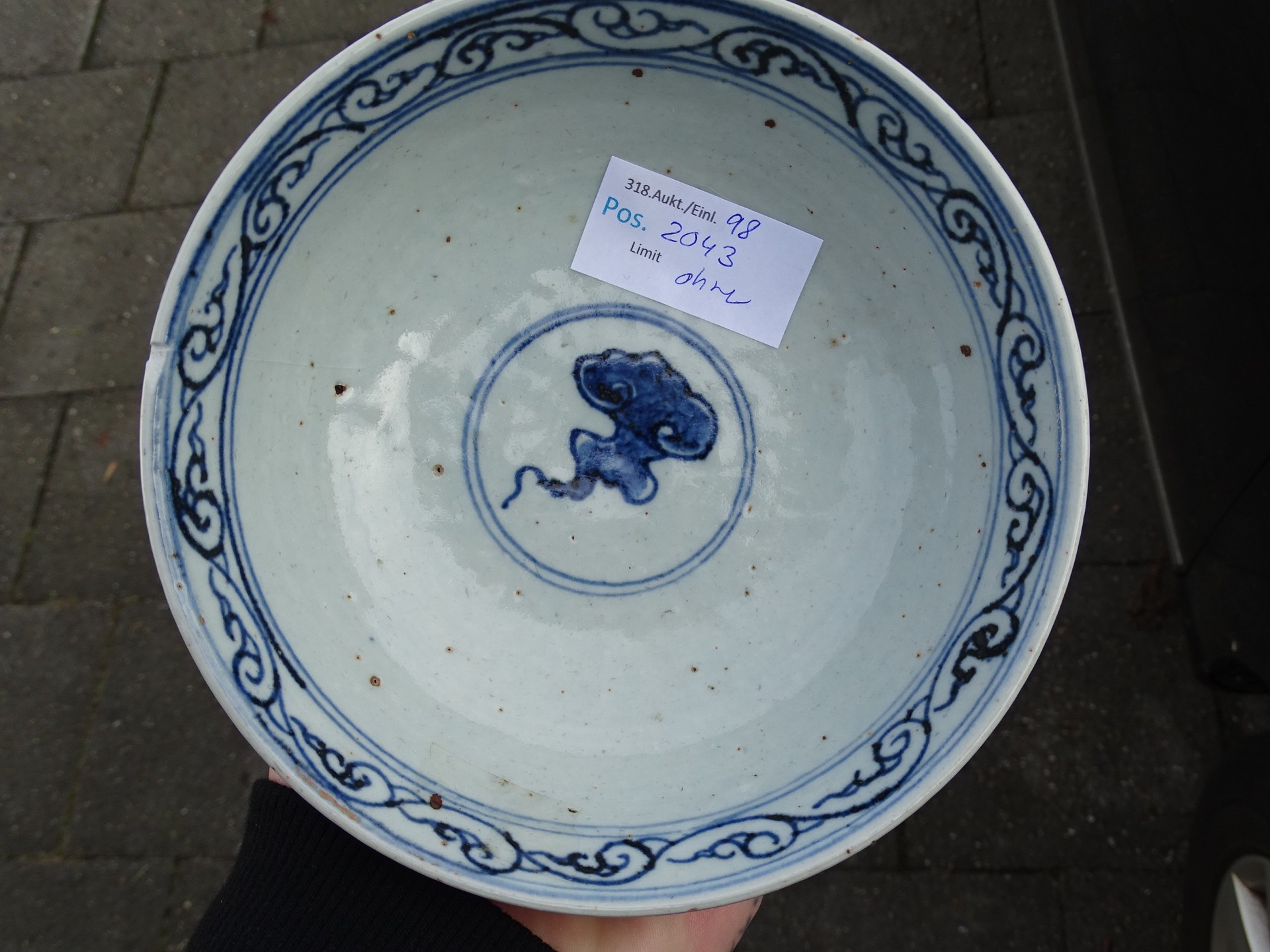 Losnummer 2043 - Schale auf Stand, China, Blaumalerei, Rand bestossen, H-11cm D-17cm.