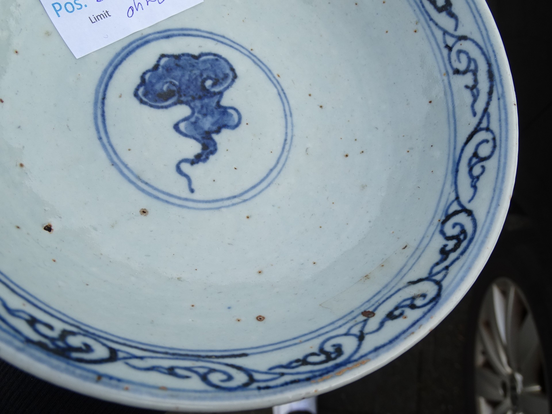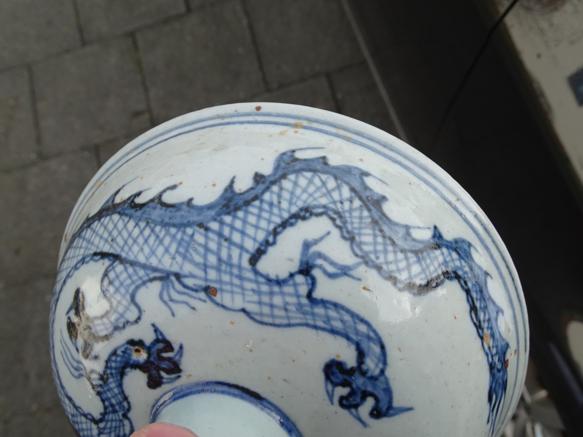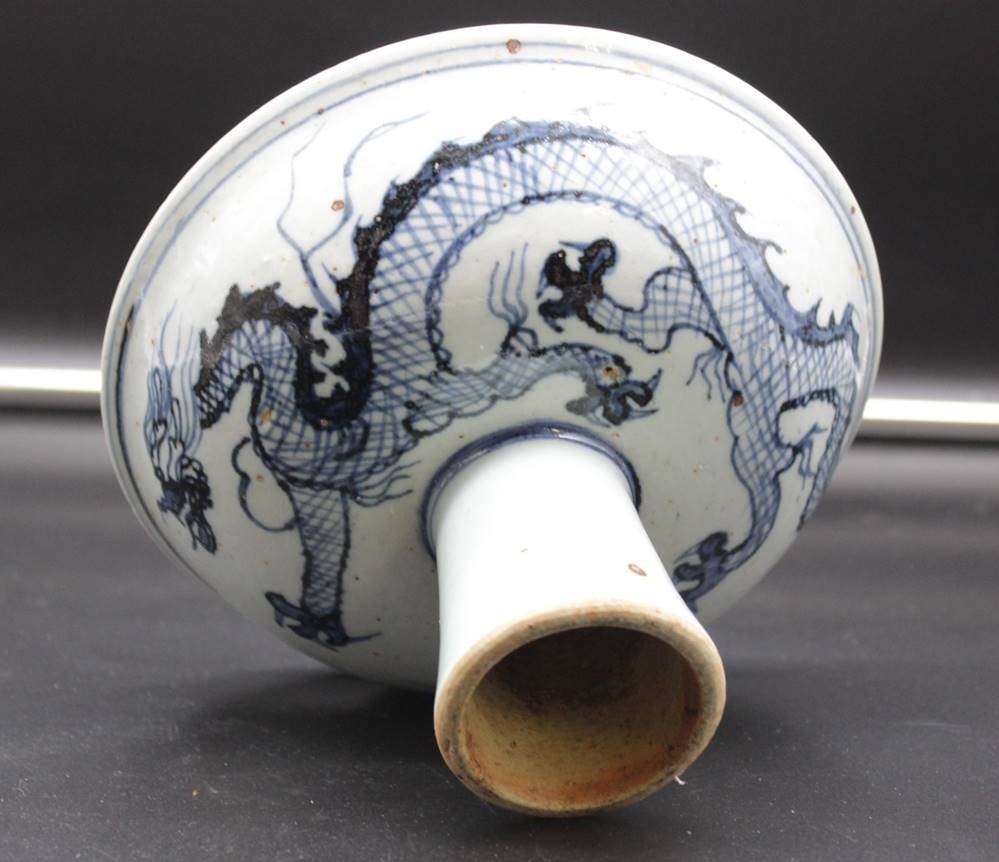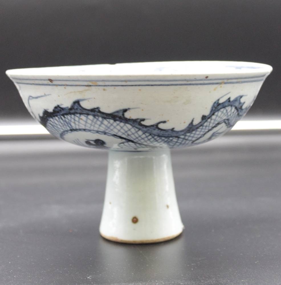 Losnummer 2043 - Schale auf Stand, China, Blaumalerei, Rand bestossen, H-11cm D-17cm.