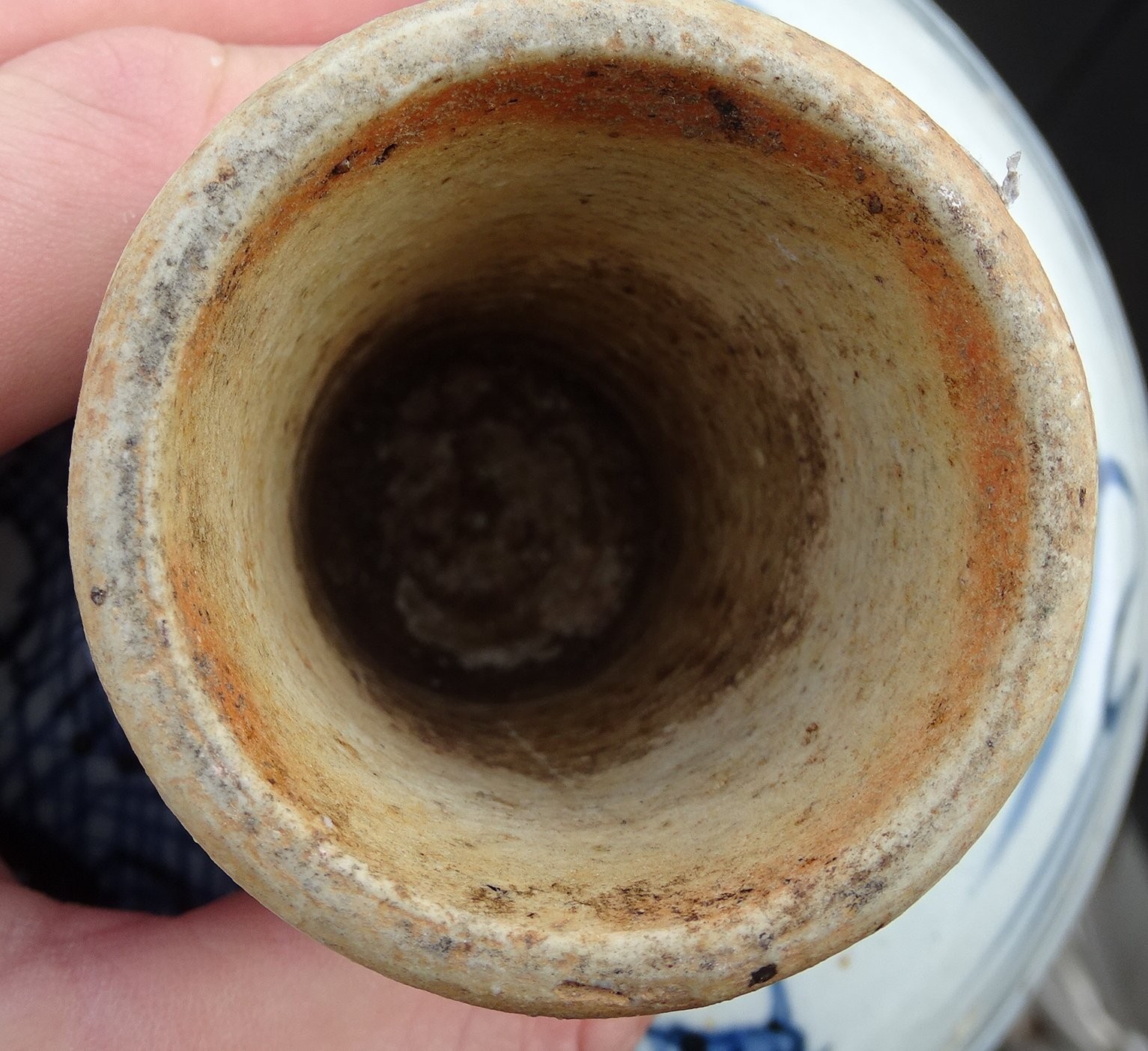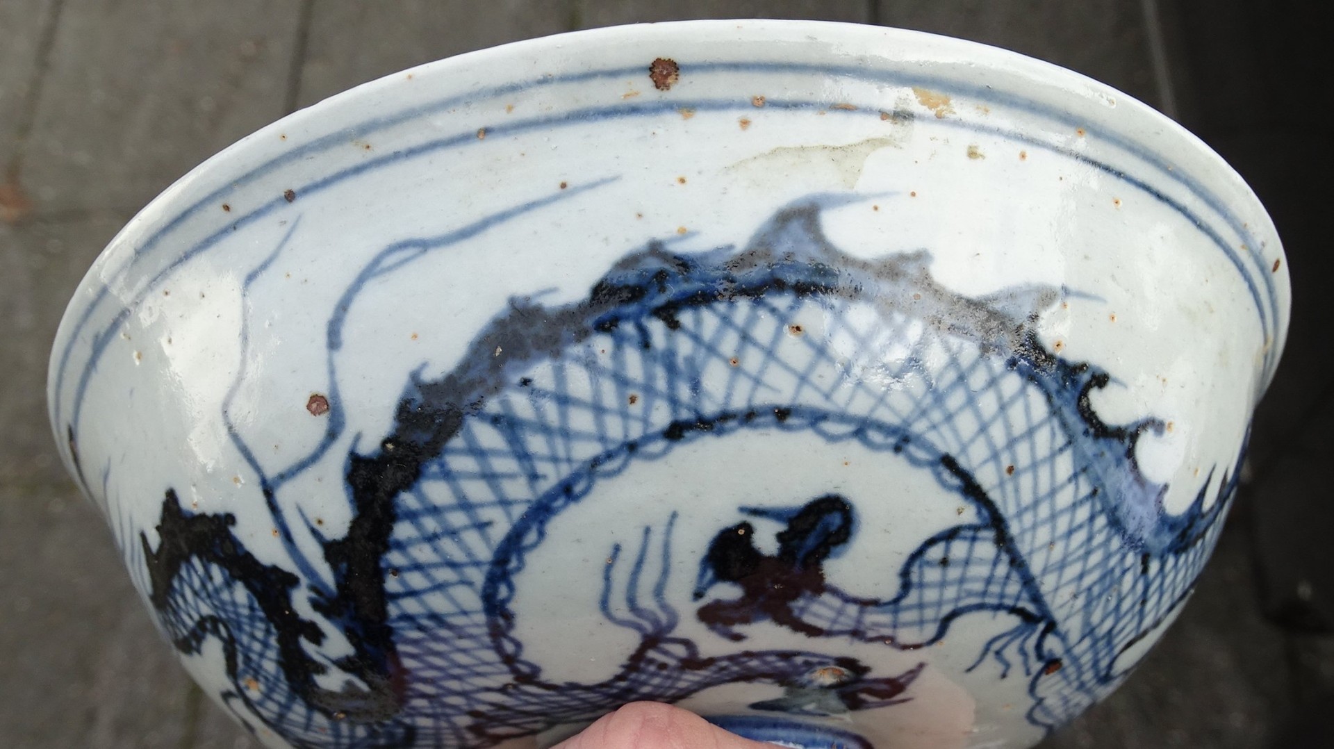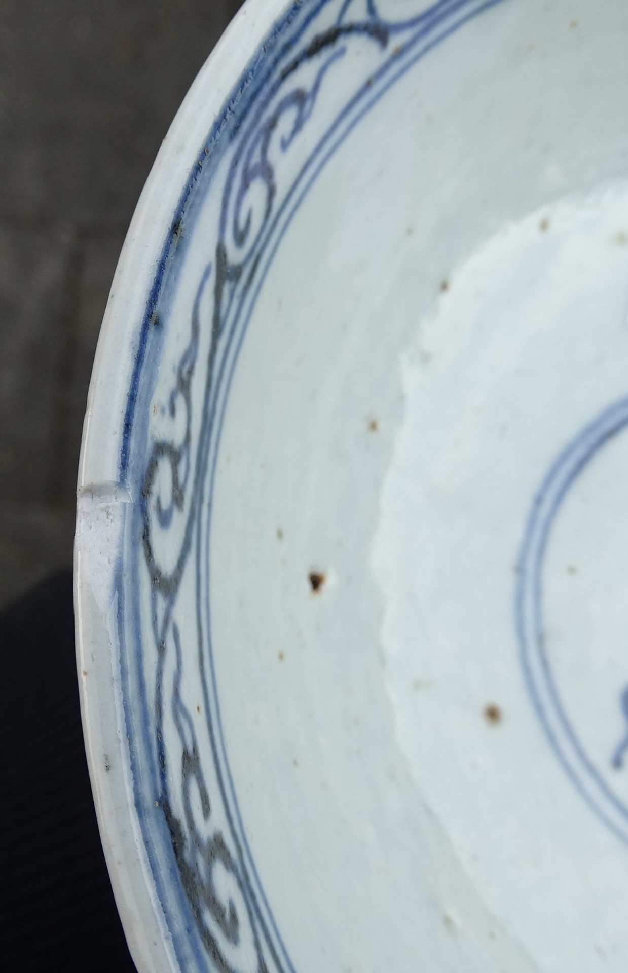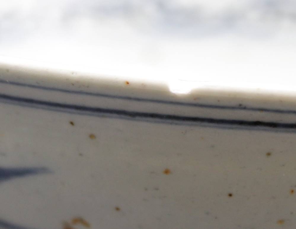 Losnummer 2043 - Schale auf Stand, China, Blaumalerei, Rand bestossen, H-11cm D-17cm.