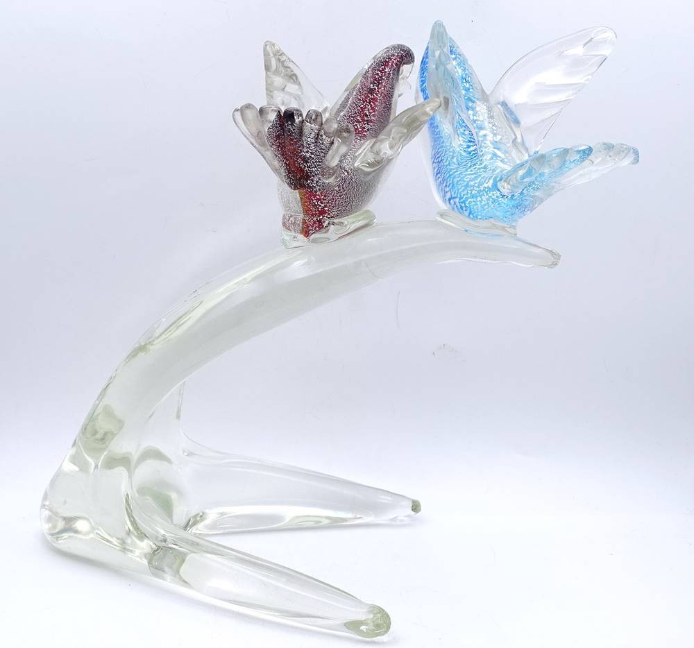 2 Vögel auf Ast, Murano Glas, blau / rot, H. 25cm, L. 25,0cm [1]