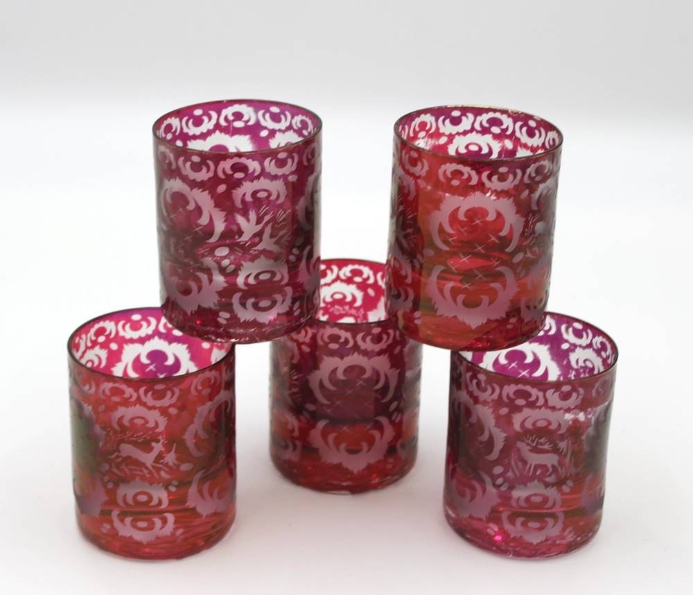 5x Wassergläser, überfangen und beschliffen, Wilddarstellungen, H-8cm.