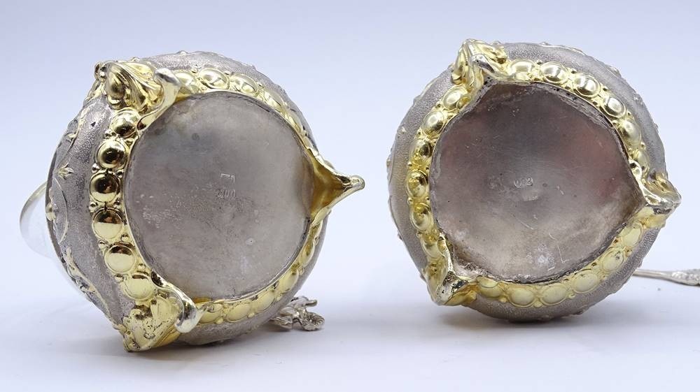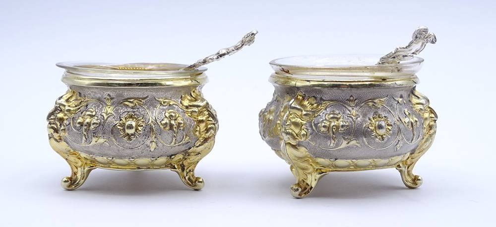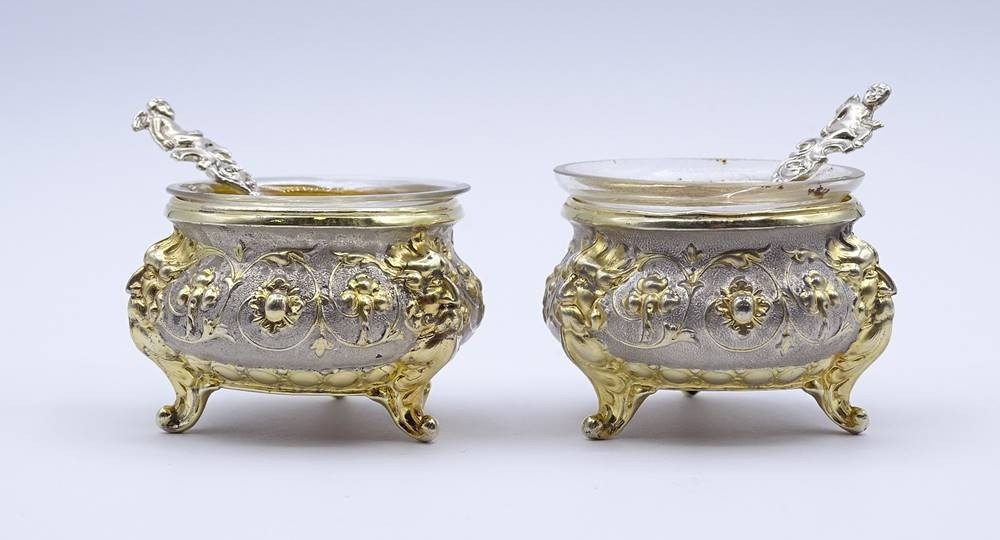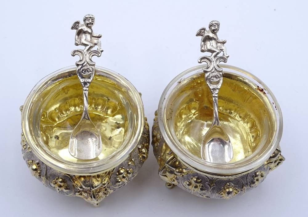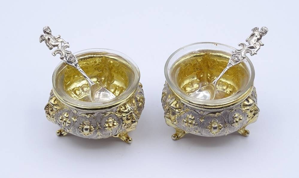 Paar Silber Salieren, Silber 0.800, mit zwei Gewürzlöffel, Silber zus. 38g. [1]