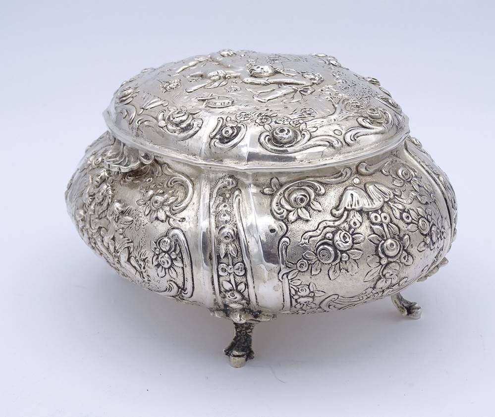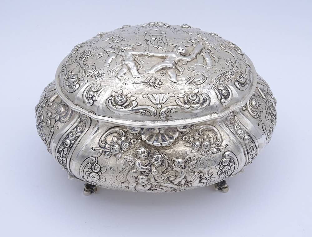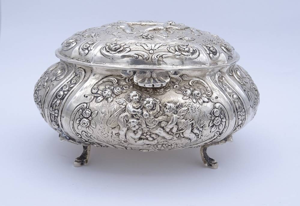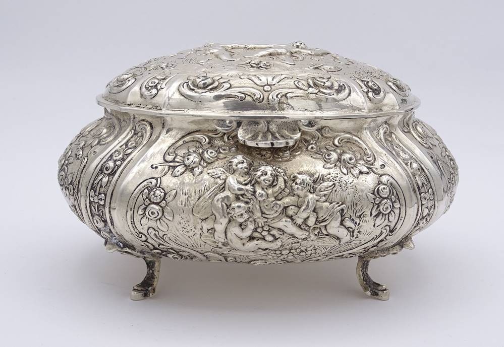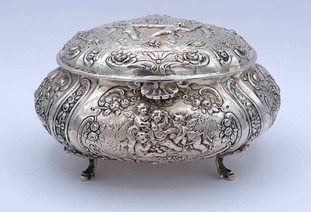 Schöne verzierte Zuckerdose , Silber 0.800, 320g., 14,5 x 12cm, H. 9,5cm [1]