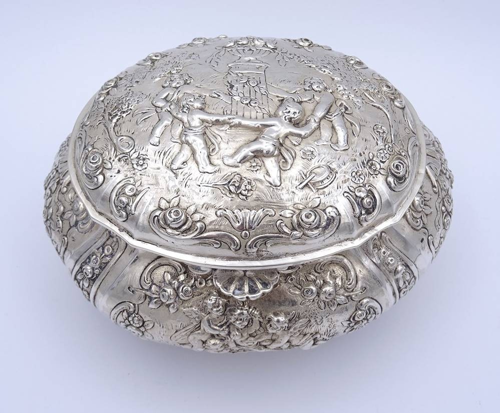 Losnummer 4023 - Schöne verzierte Zuckerdose , Silber 0.800, 320g., 14,5 x 12cm, H. 9,5cm