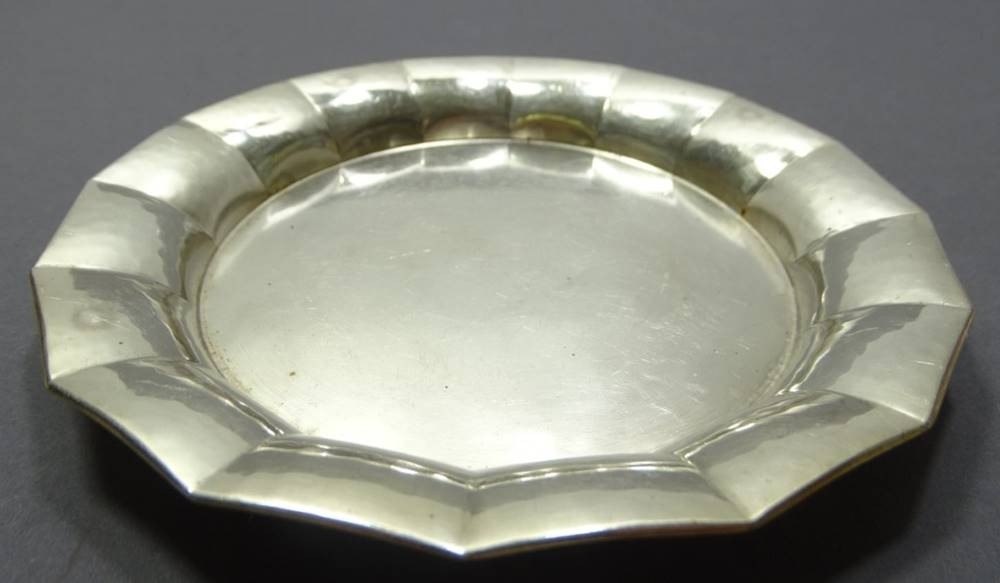 Silberteller, 800/000, mit Kelch-Punze, Ø 14 cm, 66 gr., mit Altersspuren, Kratzer, Aufkleberreste, kleine Dellen [1]
