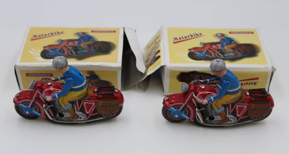 2x Blech-Motoräder, China, MS 368, Schlüsselwerke laufen, orig. Kartons, Schlüssel fehlen [1]