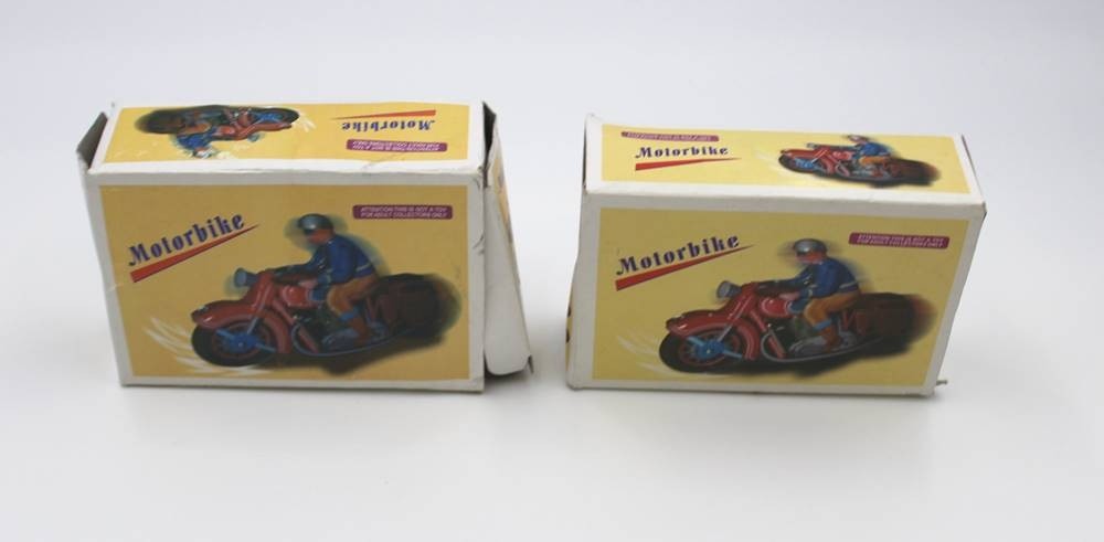 2x Blech-Motoräder, China, MS 368, Schlüsselwerke laufen, orig. Kartons, Schlüssel fehlen