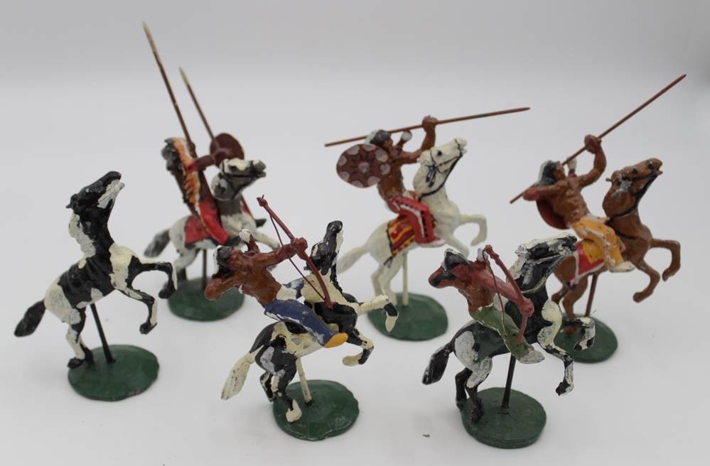 6x Indianerfiguren zu Pferd sowie einzelnes Pferd, Metall bemalt, ca. H-12cm. [1]