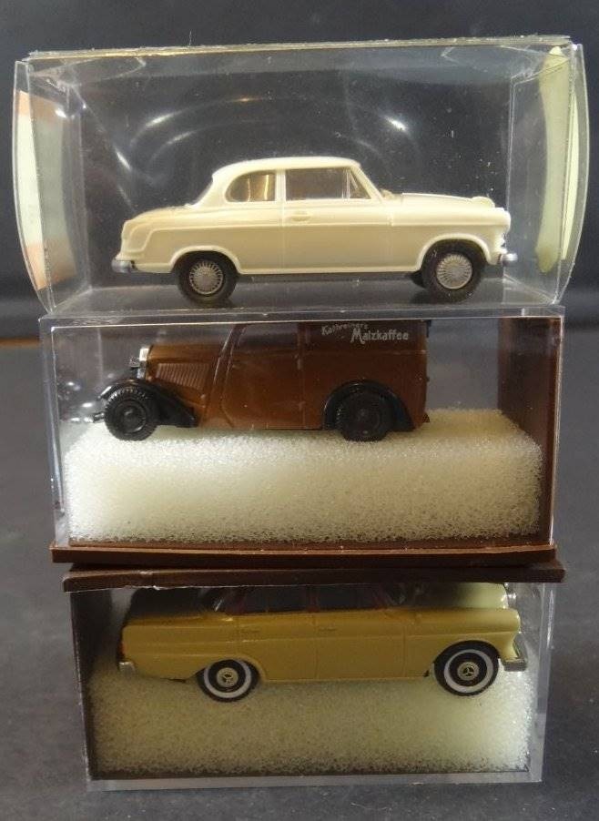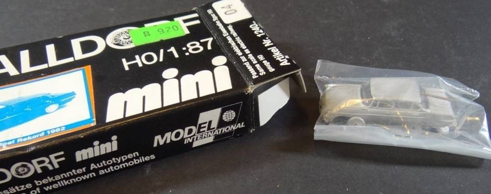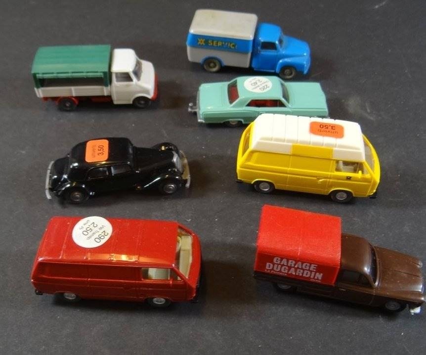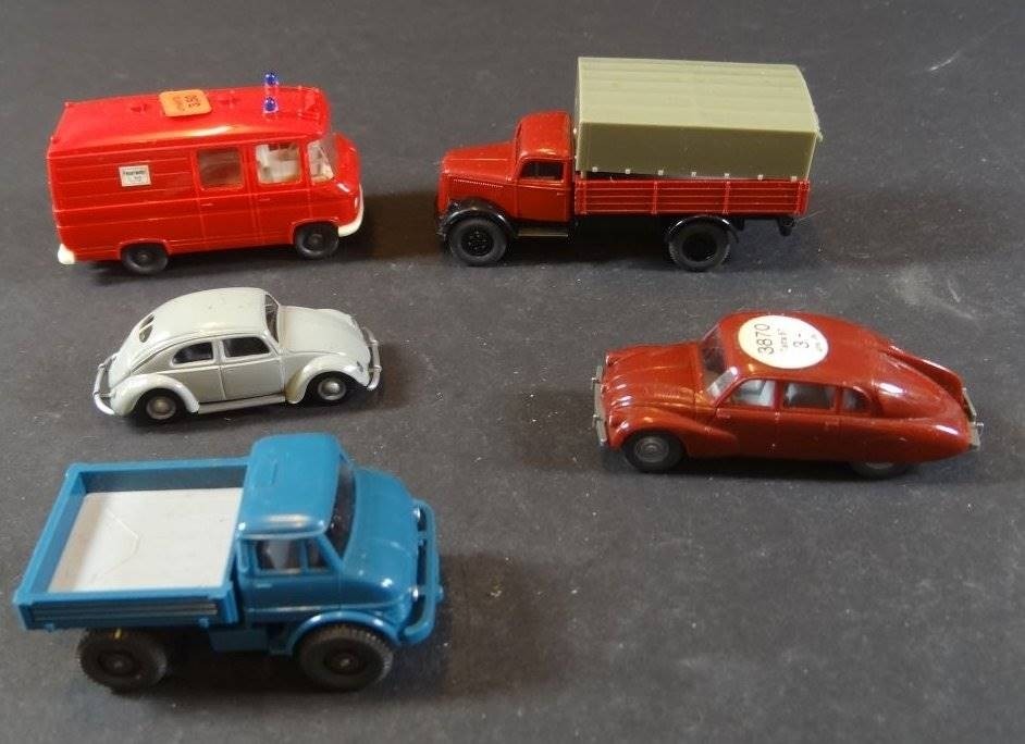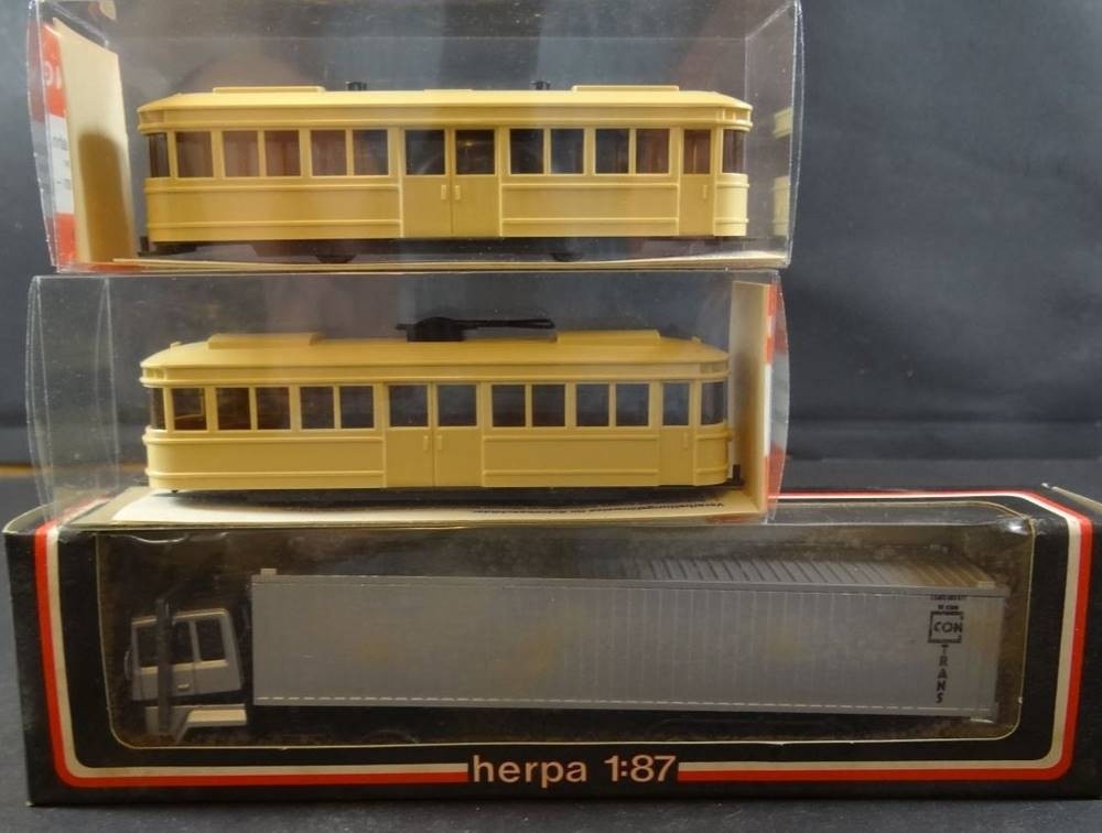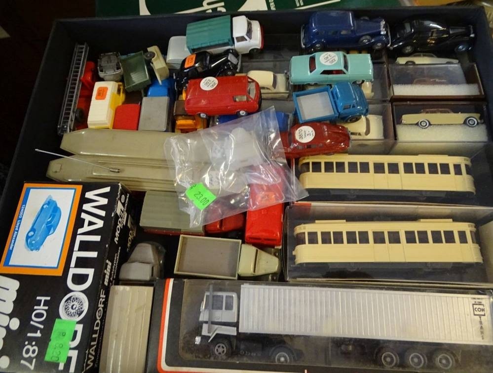 Karton mit ca. 37 Automodellen, 4x Strassenbahnen etc., hpts. Wiking, 2x Walldorf, tw. boxed [1]