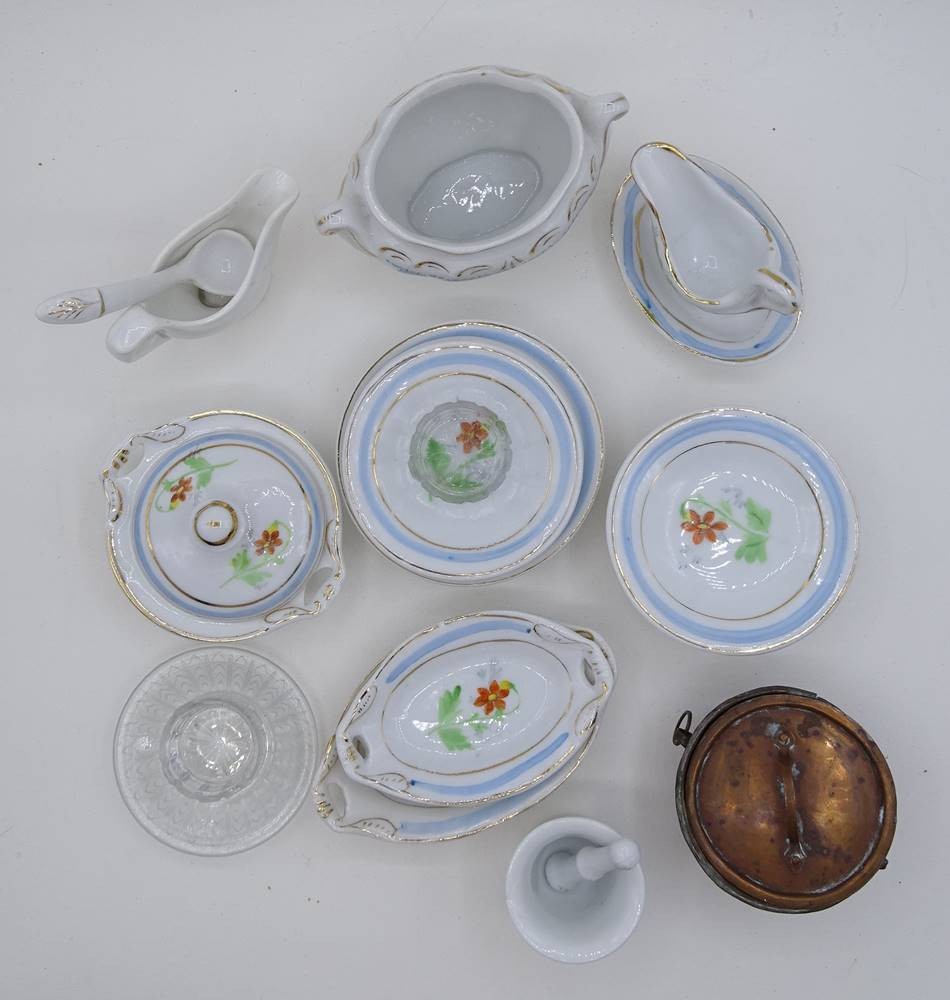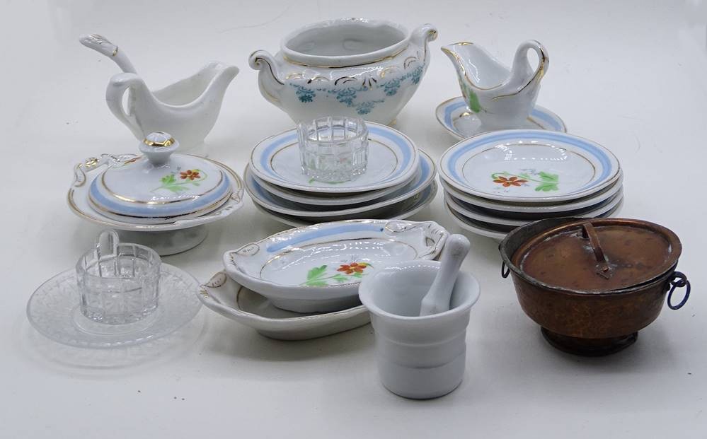 Konvolut Puppenküchenzubehör, Keramik, Kupfer, Glas, mit Altersspuren, Deckel ohne Unterteil