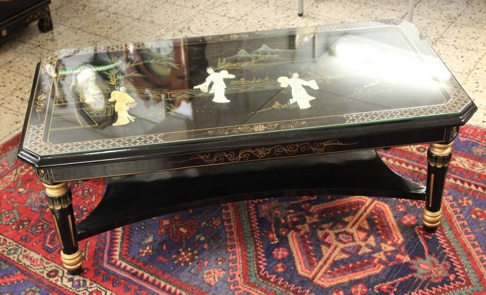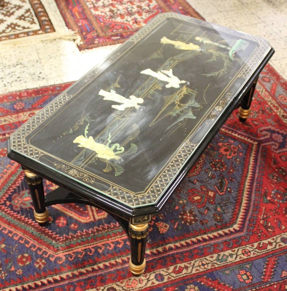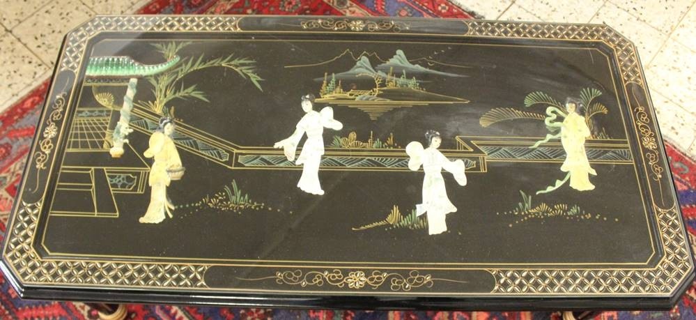 Couchtisch, Chinalack, figürliche Perlmuttauflagen, H-42cm B-108cm T-55,5cm. [1]