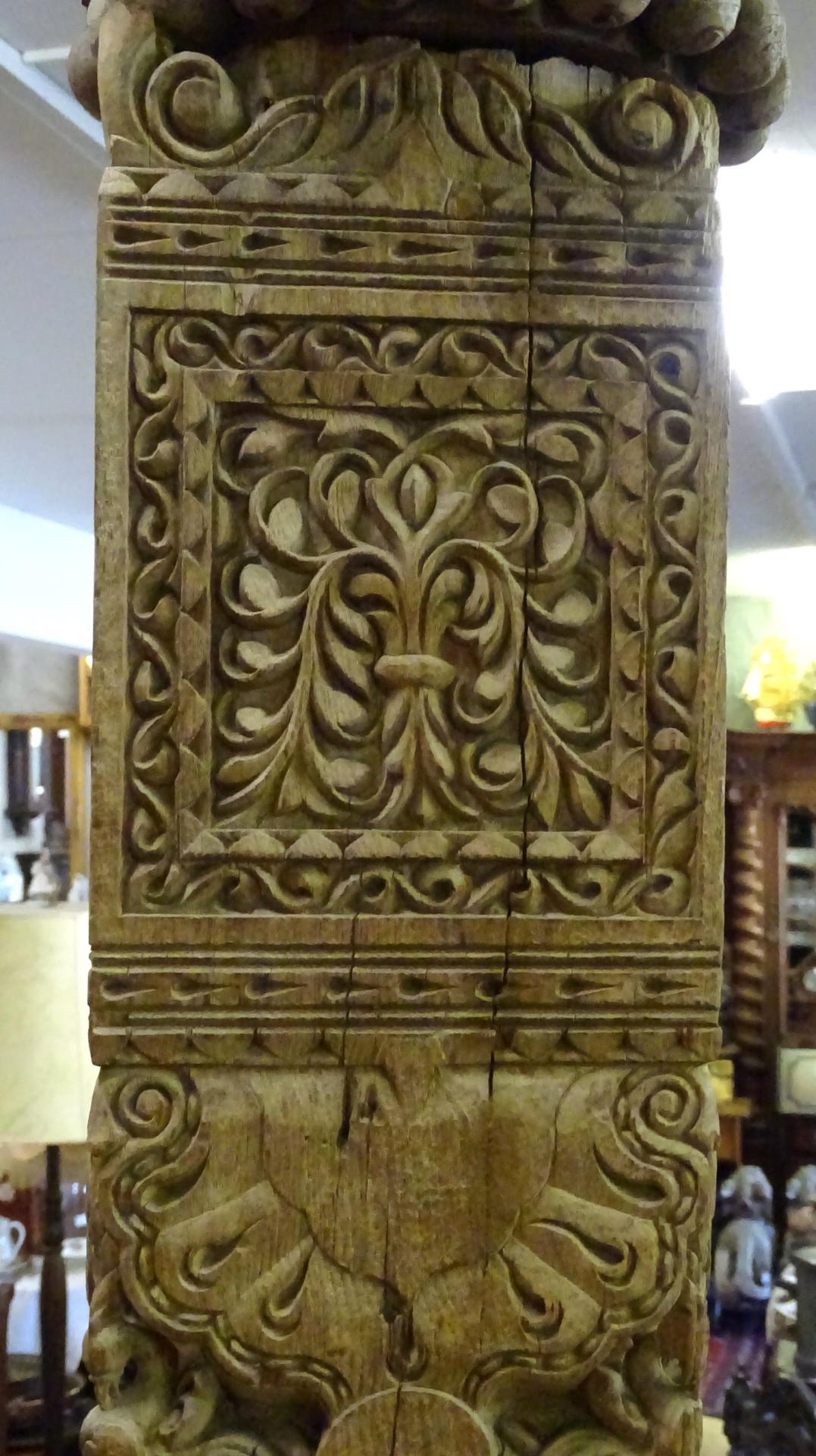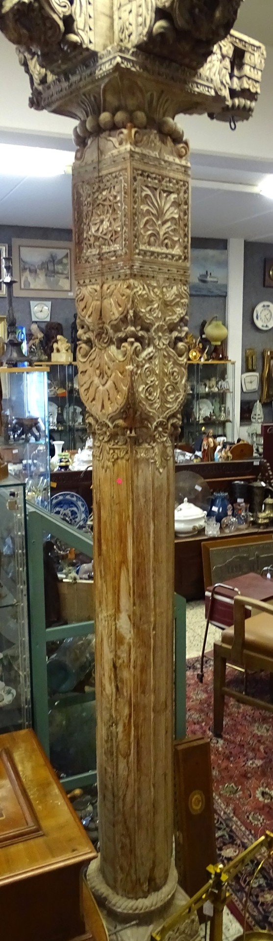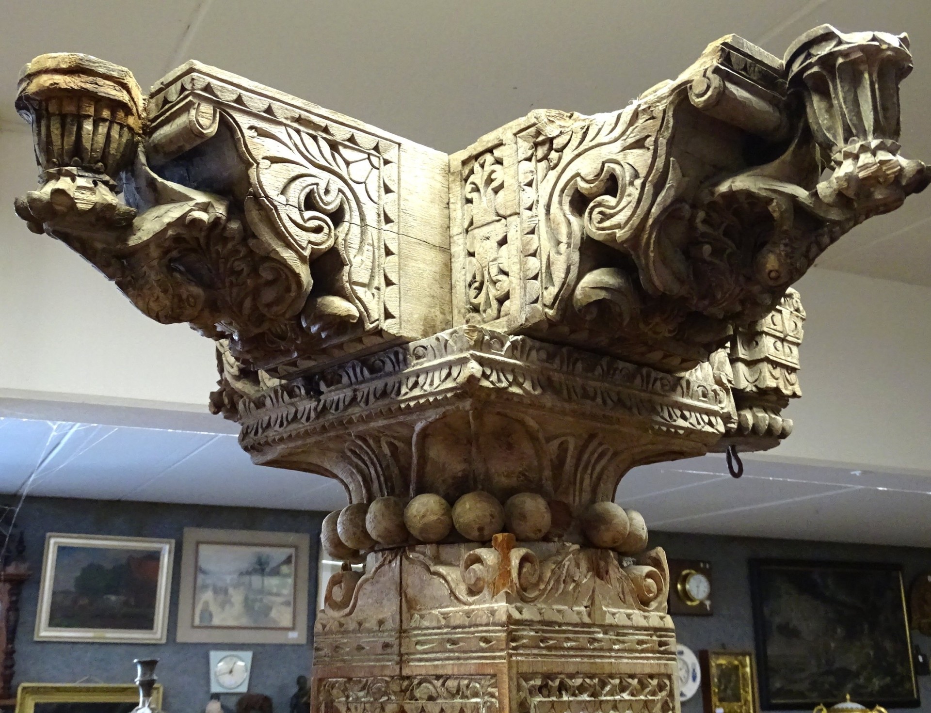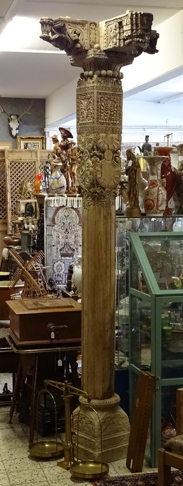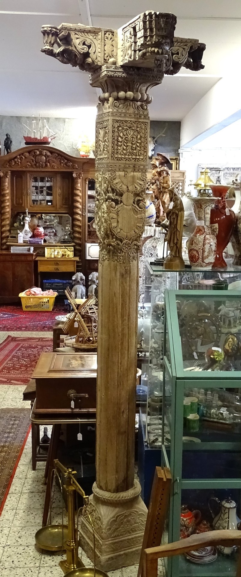Losnummer 9007 - gr. Holz-Säule, beschnitzt, mit Steinstand und beschnitzer Bekrönung, wohl Indien?, H-zus. 238 cm,
