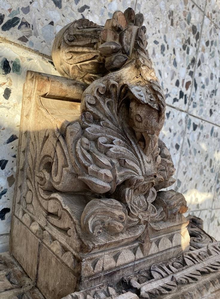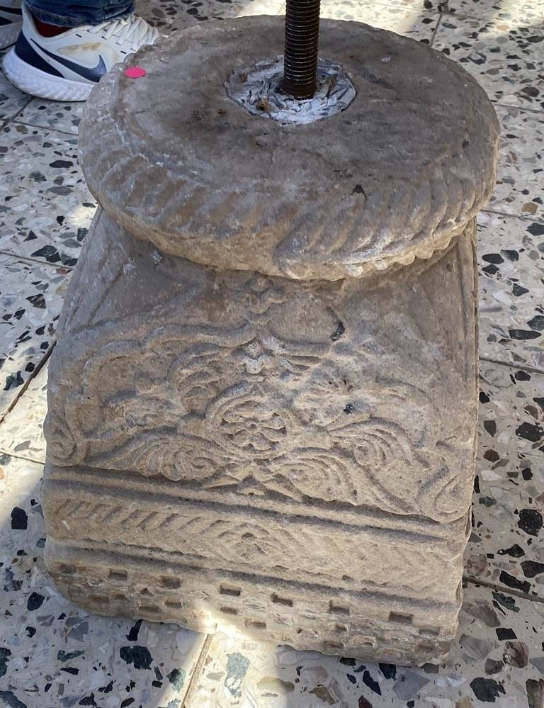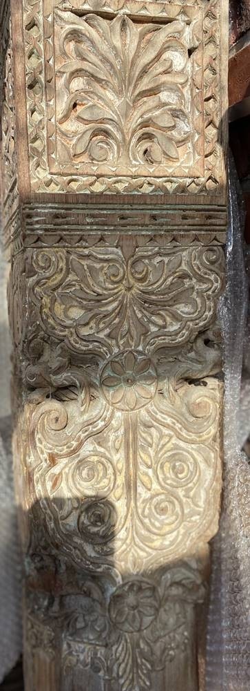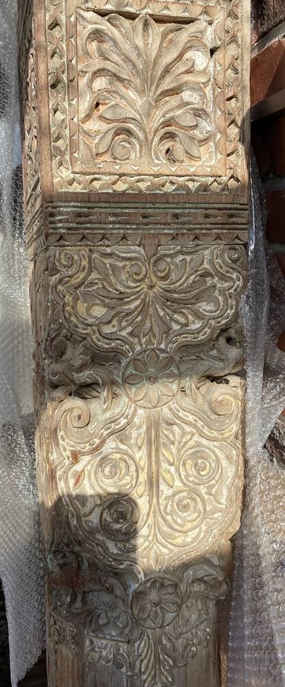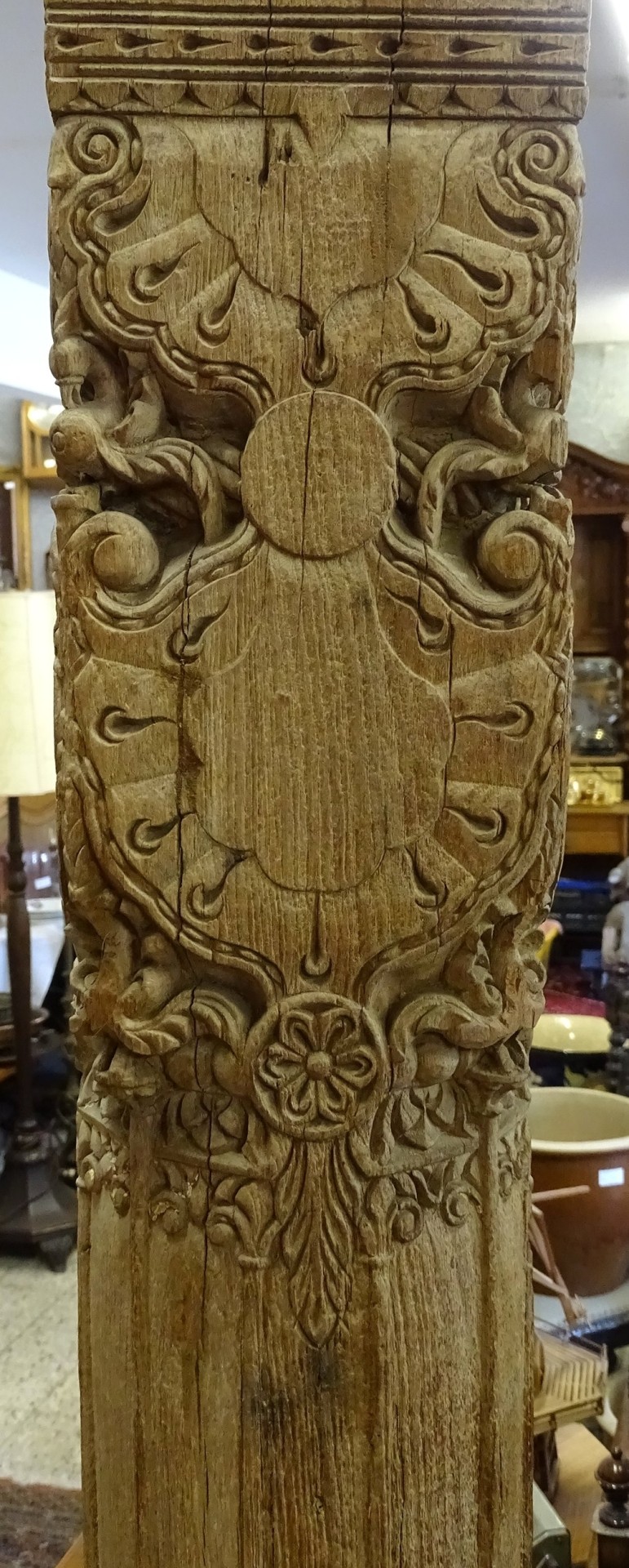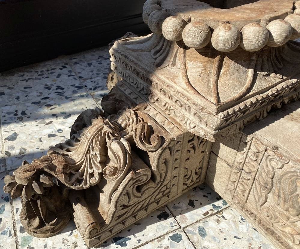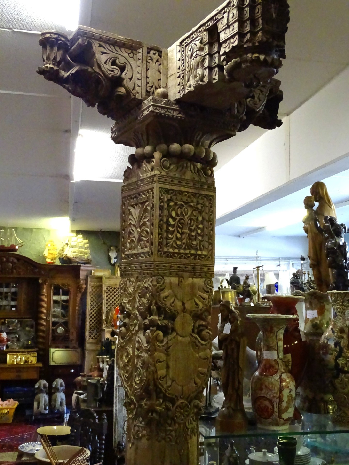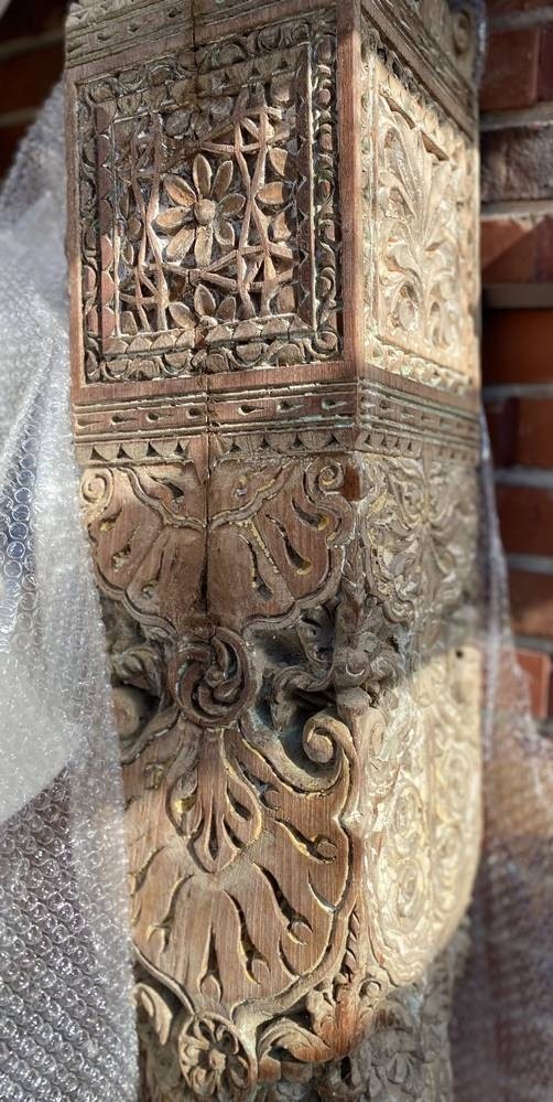 Losnummer 9007 - gr. Holz-Säule, beschnitzt, mit Steinstand und beschnitzer Bekrönung, wohl Indien?, H-zus. 238 cm,