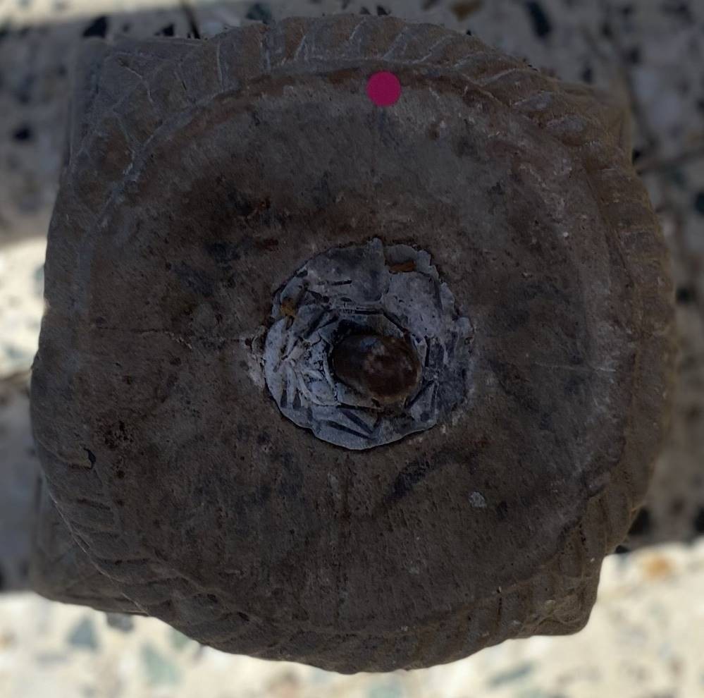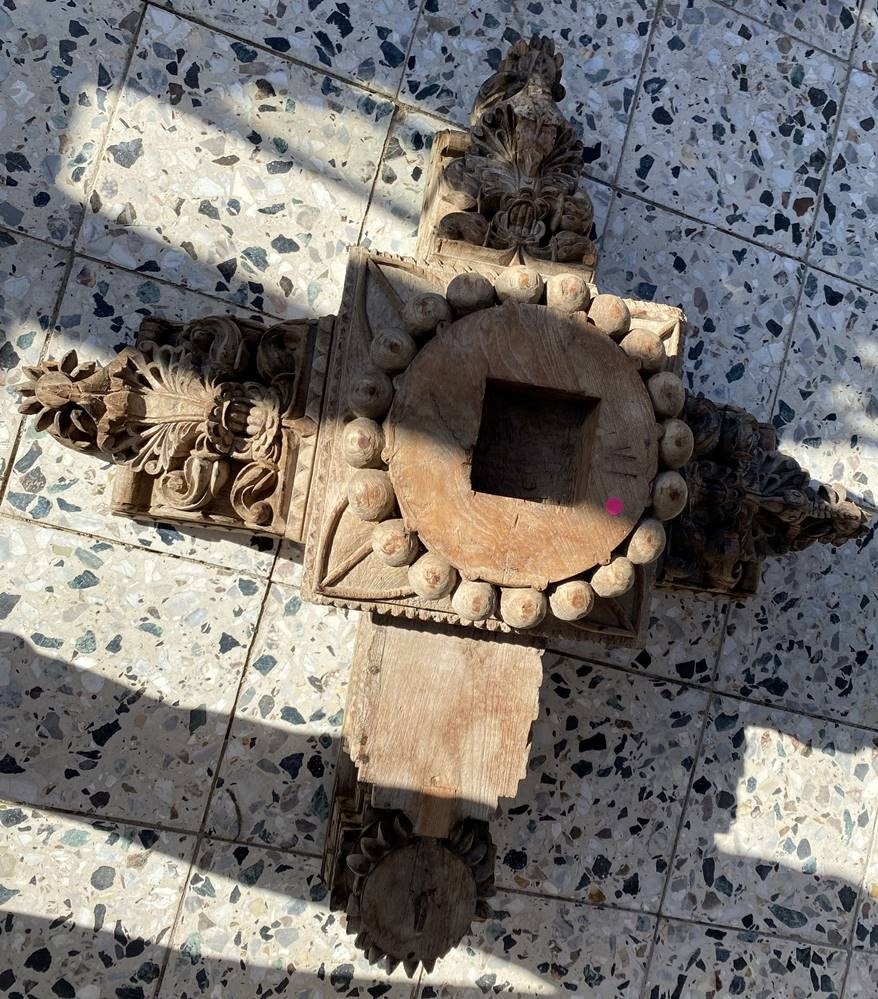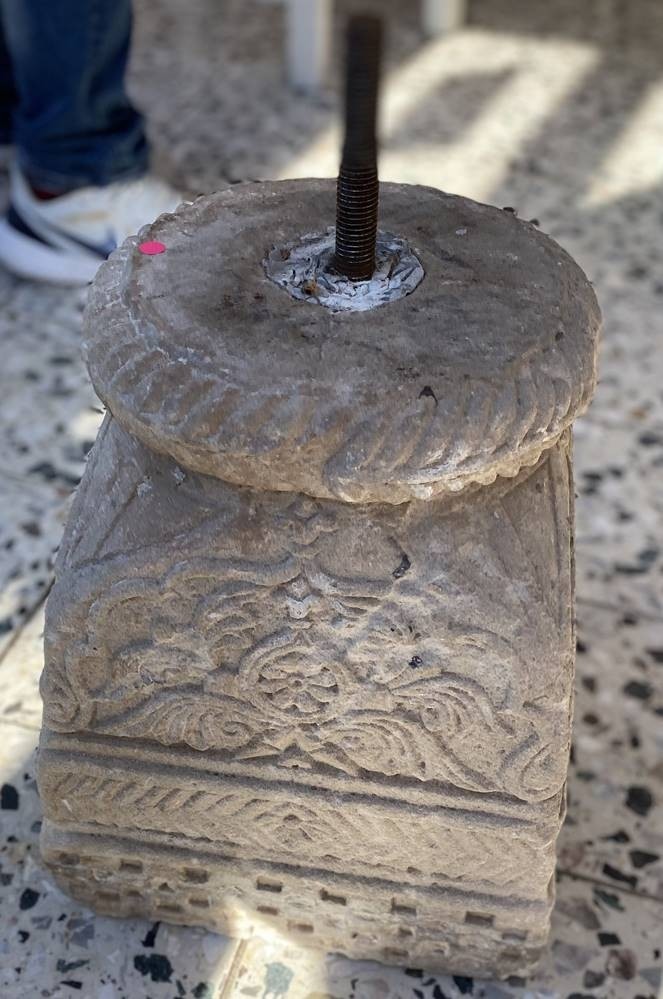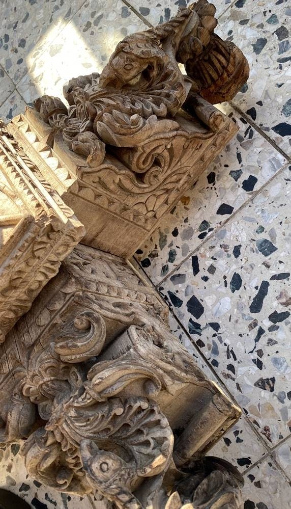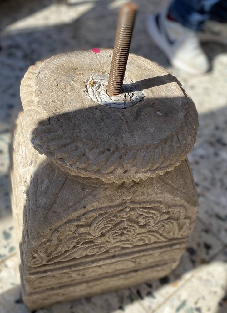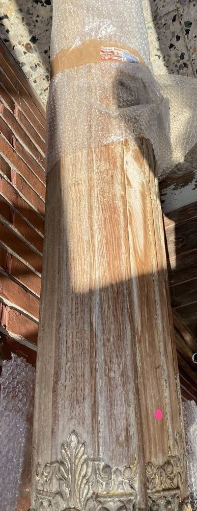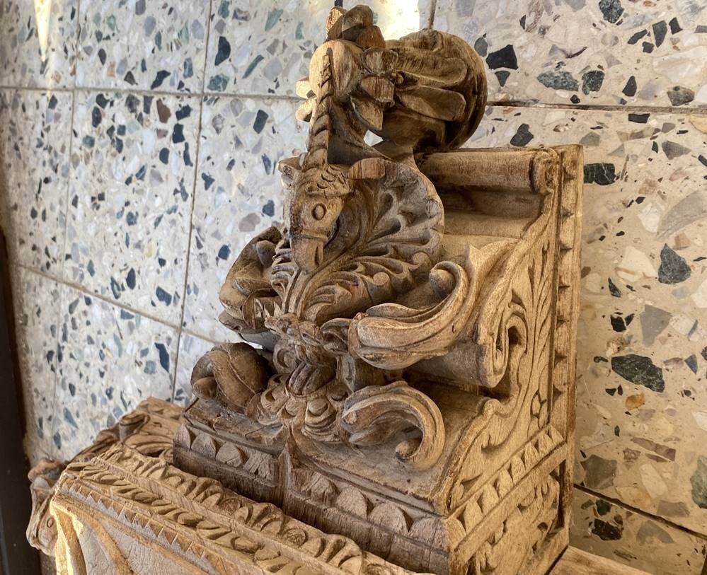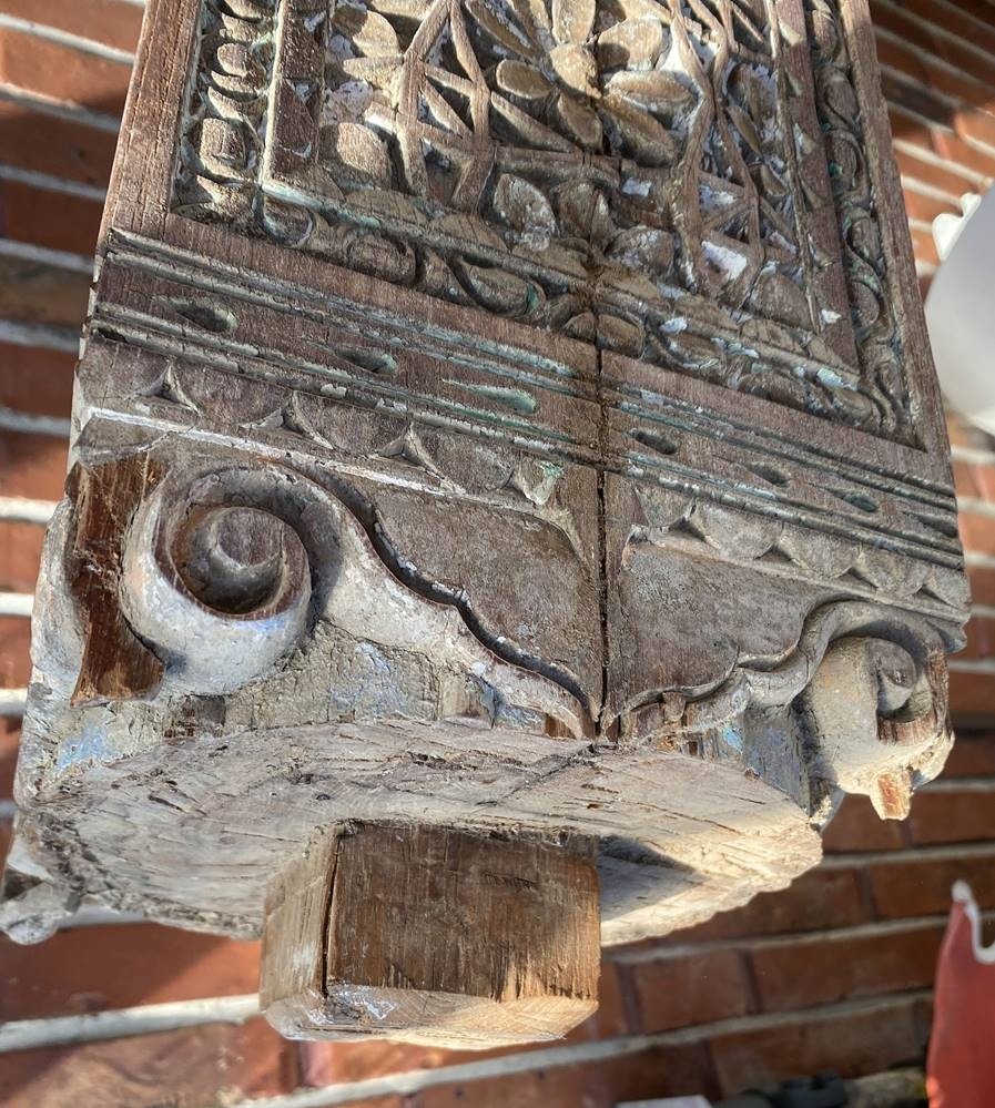 Losnummer 9007 - gr. Holz-Säule, beschnitzt, mit Steinstand und beschnitzer Bekrönung, wohl Indien?, H-zus. 238 cm,