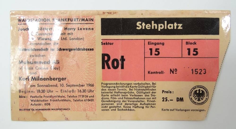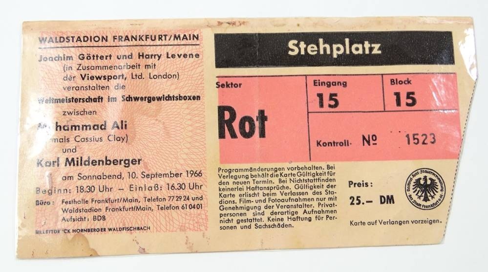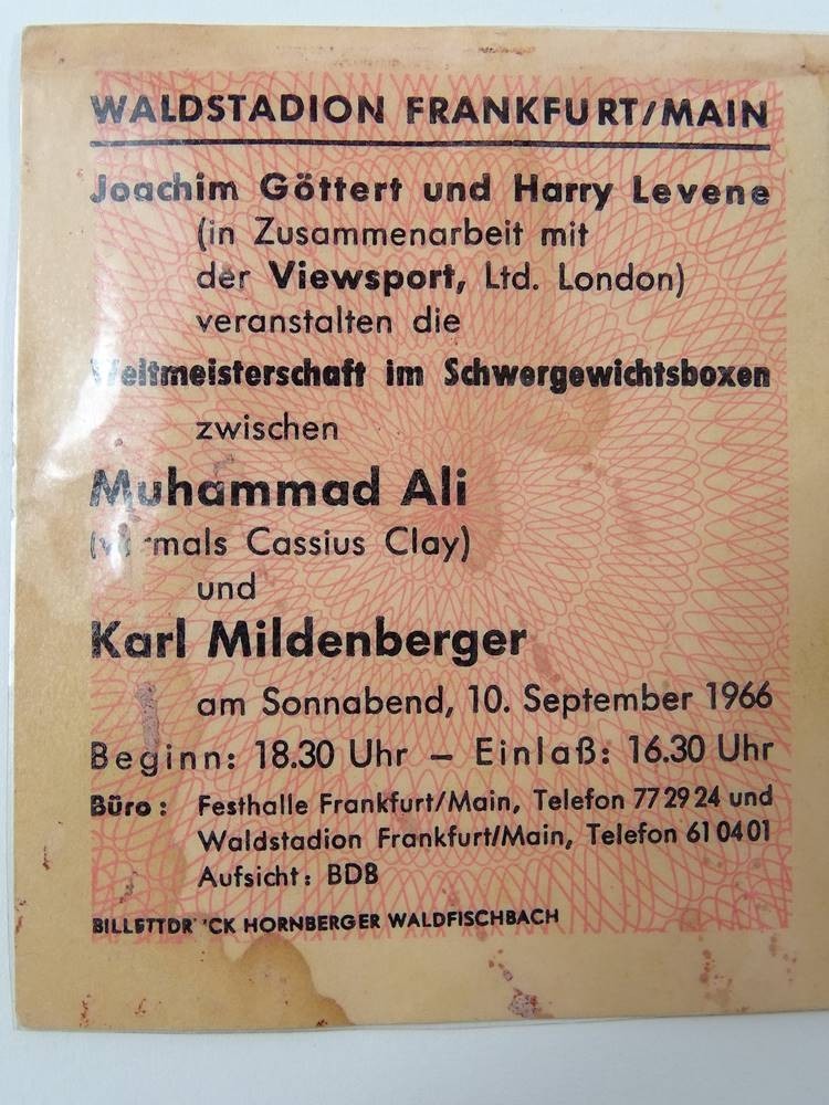 Eintrittskarte Muhammad Ali vs. Karl Mildenberger, Frankfurt 1966, Waldstadion, 17 x 8,5 cm, laminiert [1]