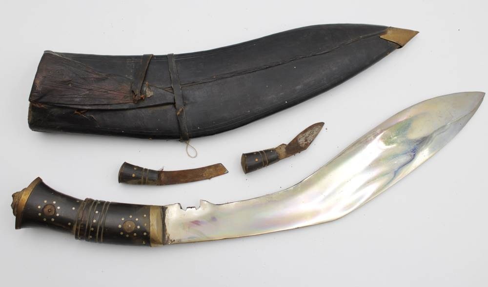 Losnummer 10102 - Kukri, Indien, älter, anbei 2 kl. Beimesser, Altersspuren, ca. L-53cm.
