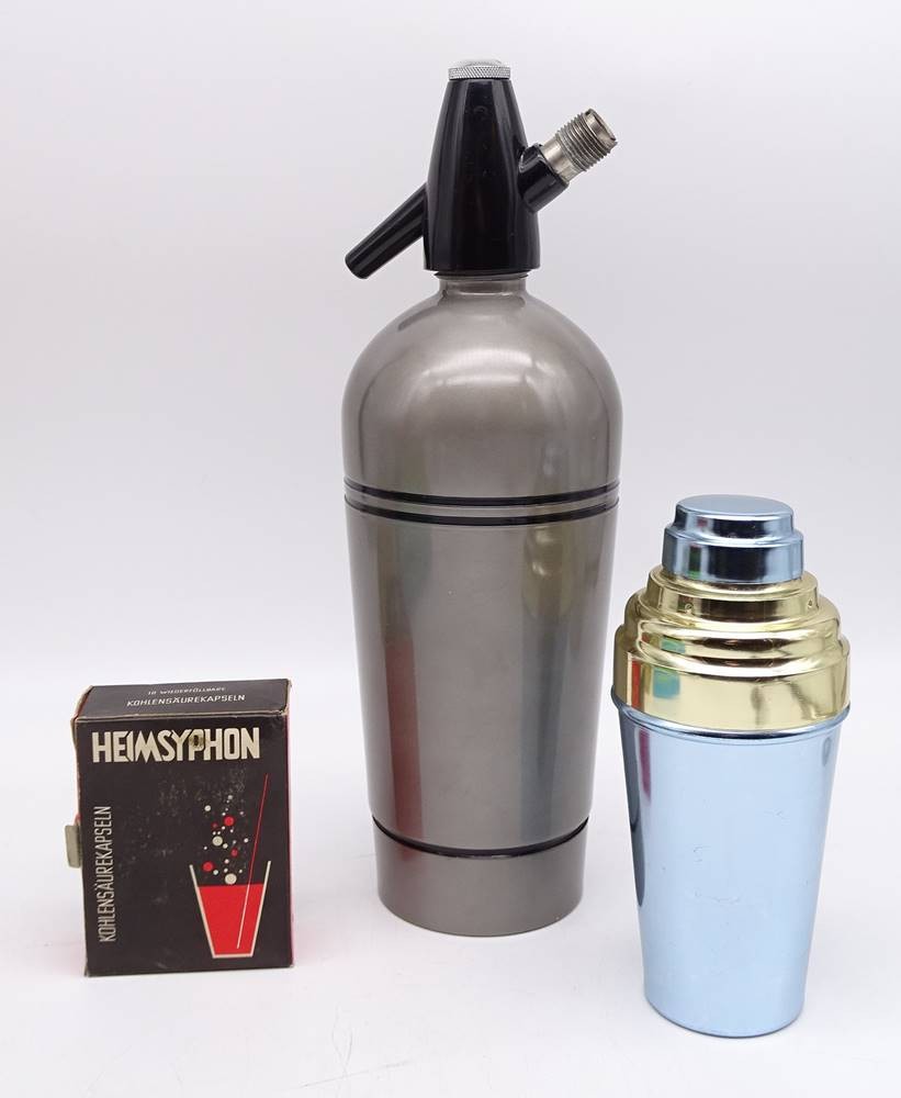 Shaker mit je 6 kleinen und großen farbigen Bechern sowie Syphon (70er-Jahre) und Schachtel wiederbefüllbare Kohlensäurekapseln, mit Alters- und Gebrauchsspuren, Funktion des Syphons nicht geprüft [1]