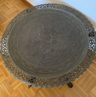 Nomaden-Klapptisch, reich beschnitzt, Metallplatte graviert, H-57 cm, D-96 cm, wohl China?