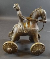 Bronze-Pferd mit Reiter, auf Rädern, wohl Kinderspielzeug, Altersspuren, ungepflegt, H-15 cm, 14x10 cm