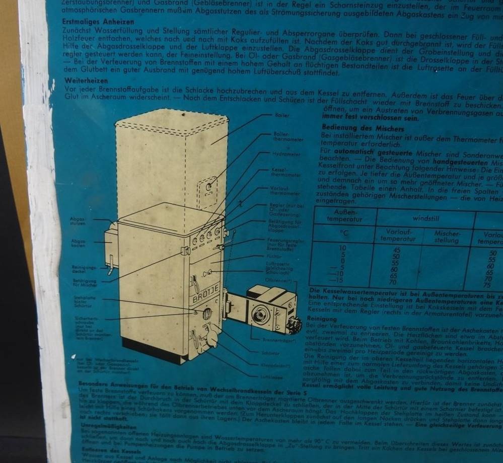 2x Blechschilder, Gebrauchsanweisung für Brötje Kessel und Brenner, 36x24 und 40x30 cm, Gebrauchsspuren, 60/70-er Jahre [1]