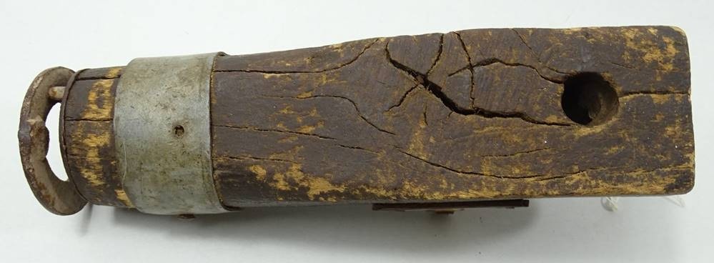 Schussapparat um 1860 für Wühlmäuse etc., L. 18 cm, mit Altersspuren, Holz rissig und leicht beschädigt, Funktion nicht geprüft [1]