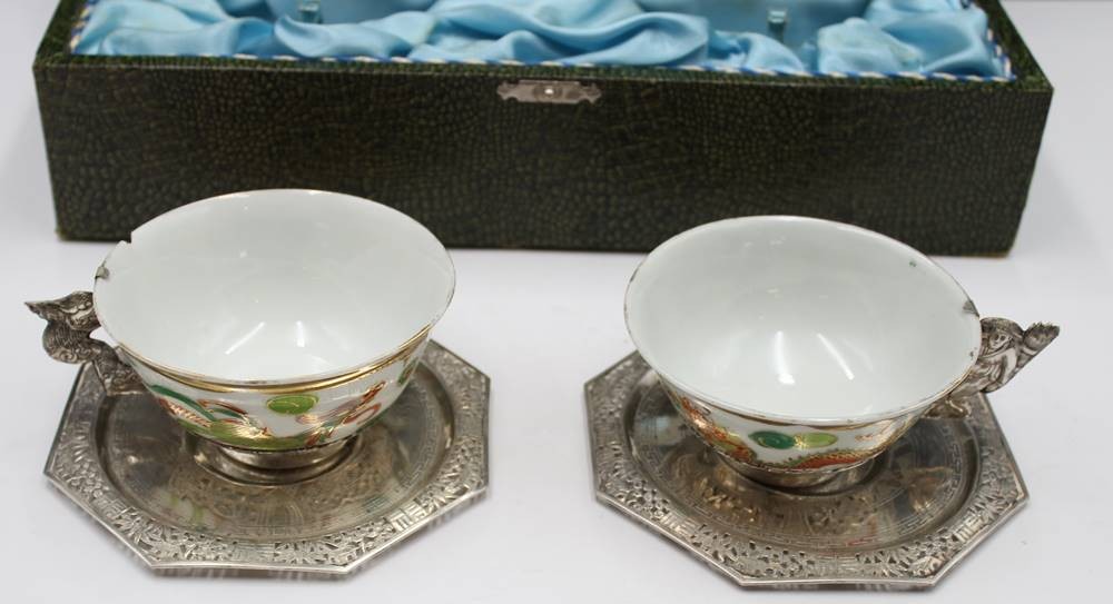 2 Teetassen mit versilberter Montur und U.T. , Vietnam, in Kasten, handbemalöt, 1 Tasse mit Chip