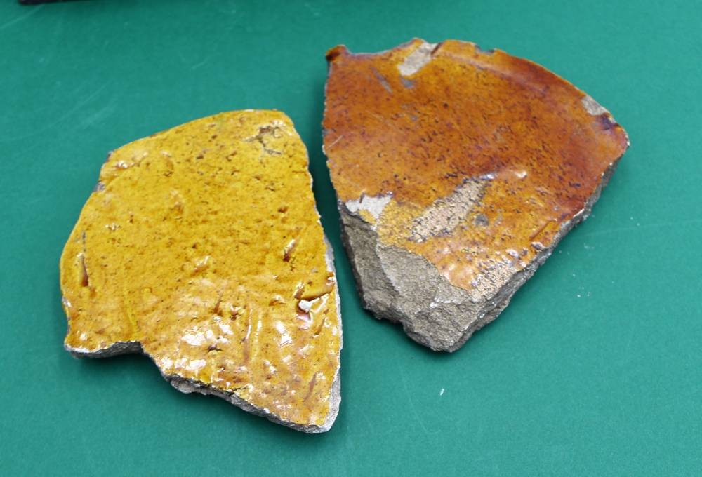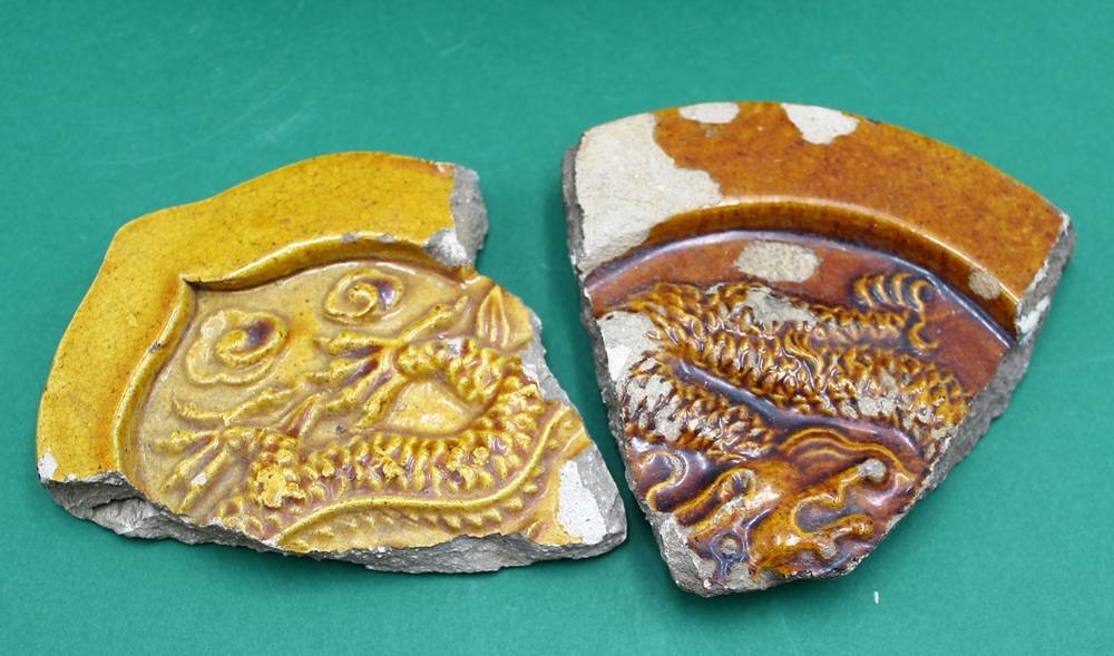 2x chinesische Keramik Stücke (Dachziegel??) (Hongwu-Periode der Ming-Dynastie??), max. B- 11cm (in Box)