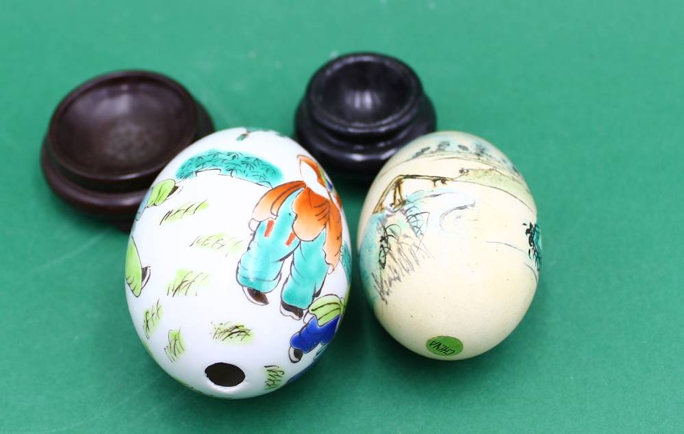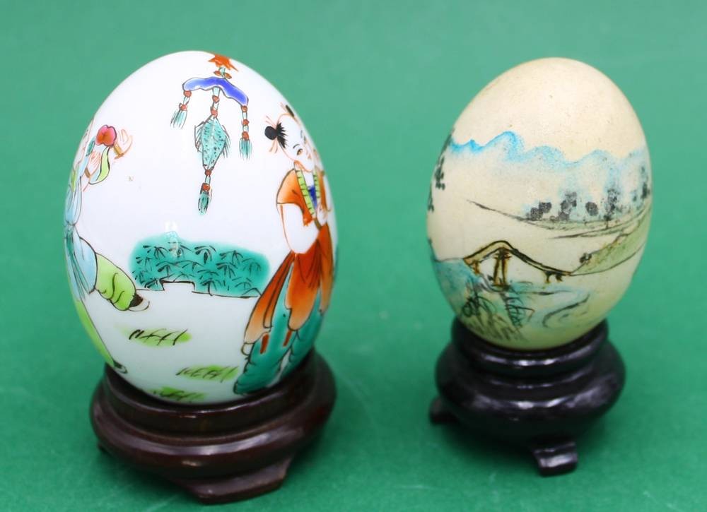 2x handbemalte chinesische Eier, auf Holzstand, 1x echte Eierschale H- 6cm, 1x Porzellan-Ei H- 8cm (Höhe je ohne Stand) [1]