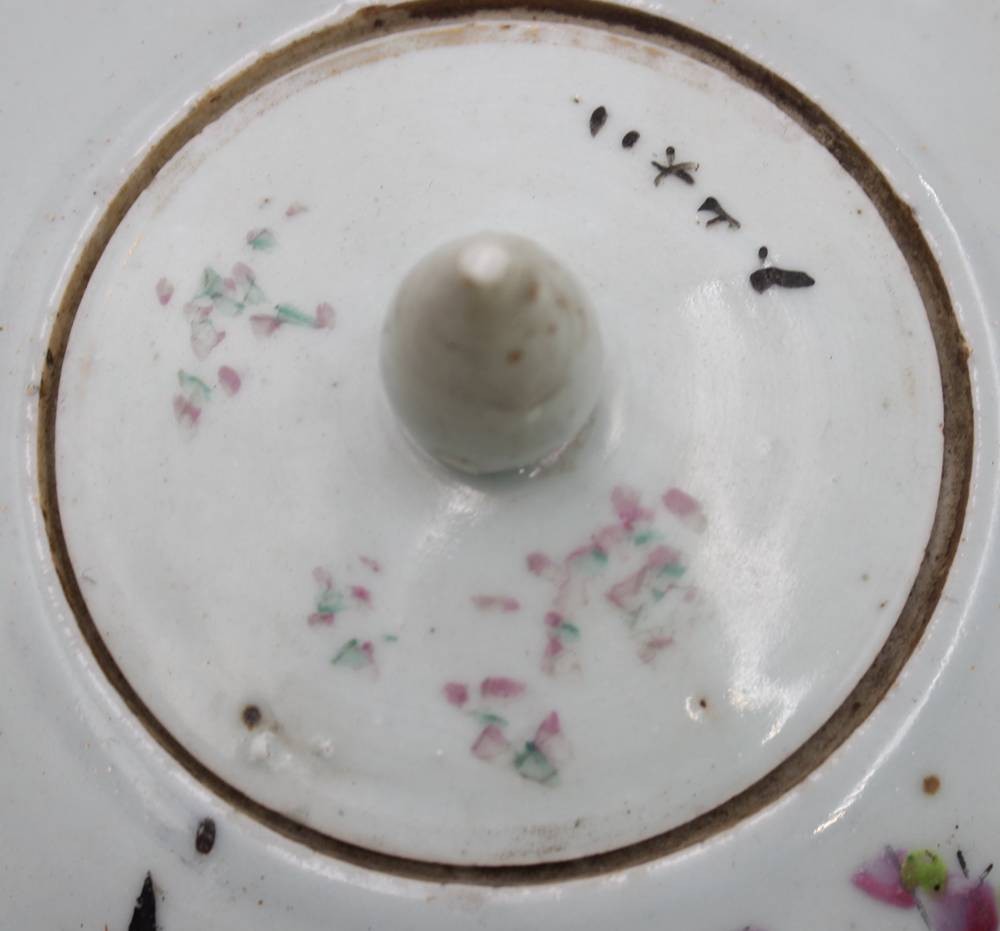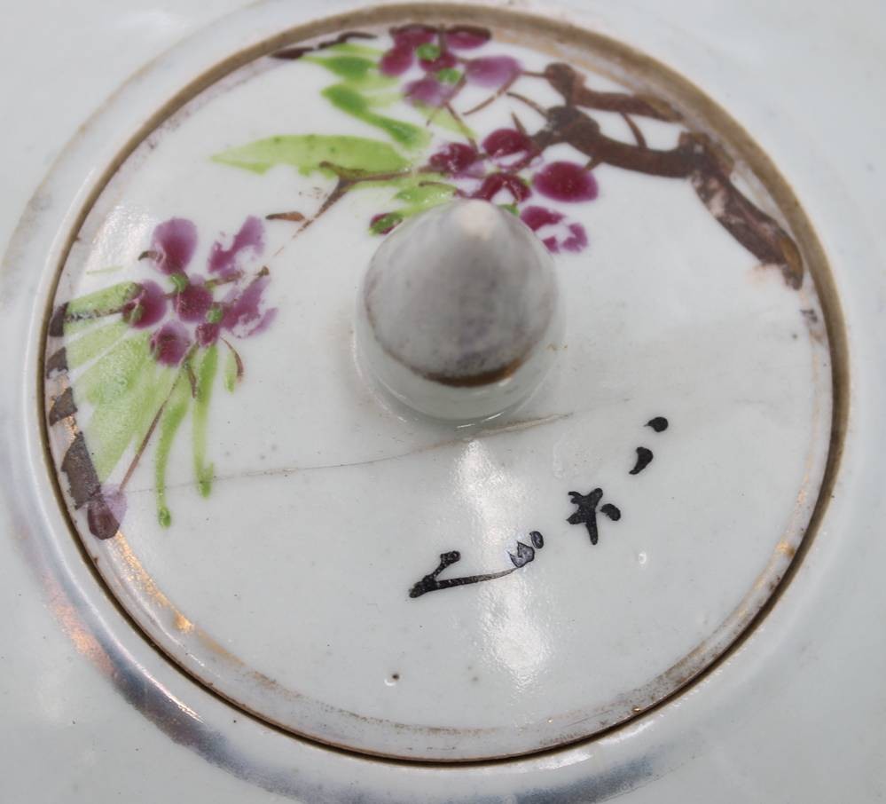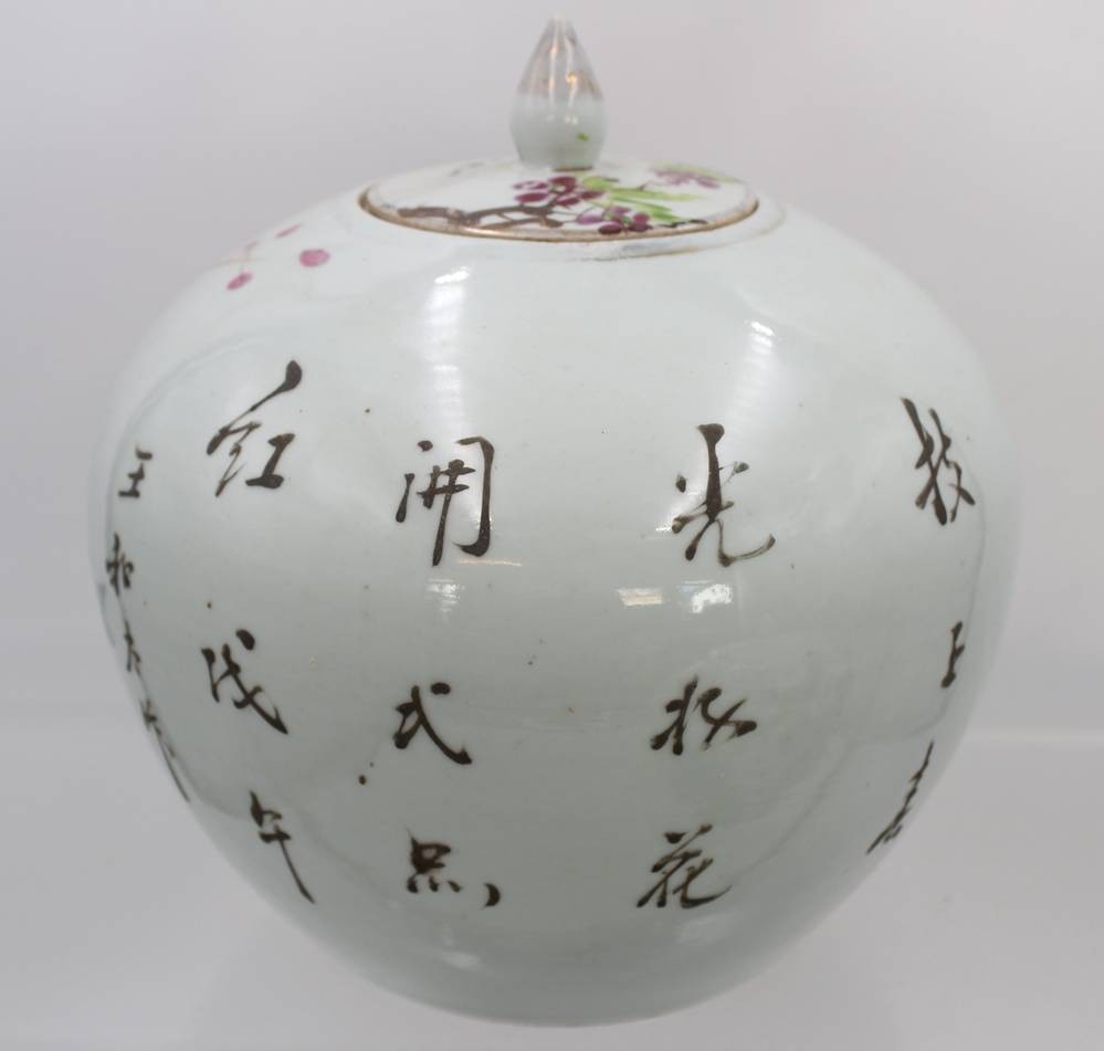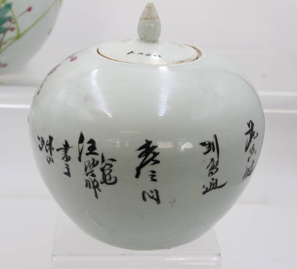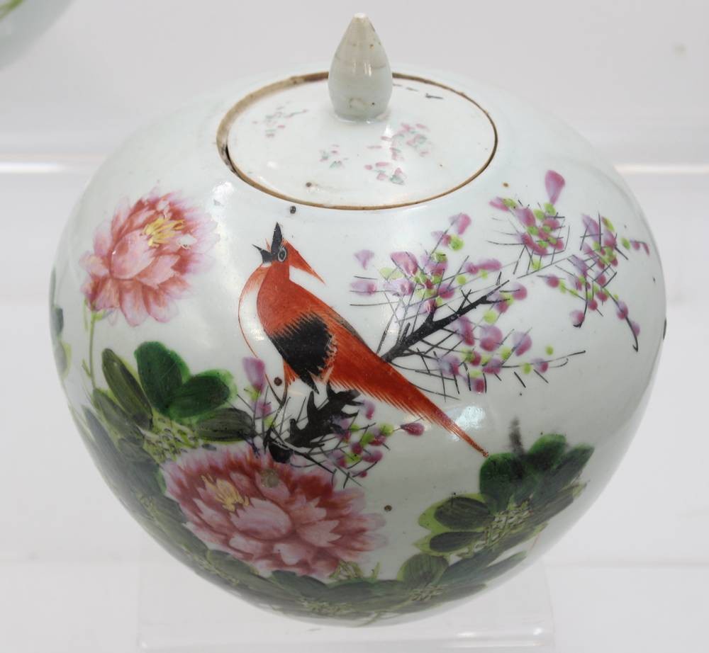 2x Ingwer-Töpfe, China, bemalt mit Vogel- und Blumenmotiven sowie Schriftzeichen, 1x Deckel geklebt und innen Rand bestossen, ca. H-20 bis 23cm