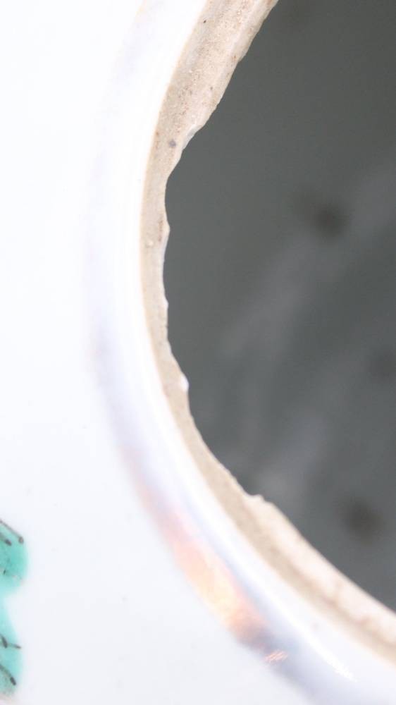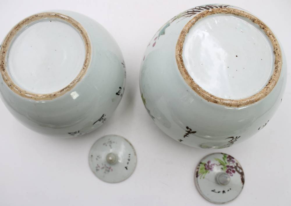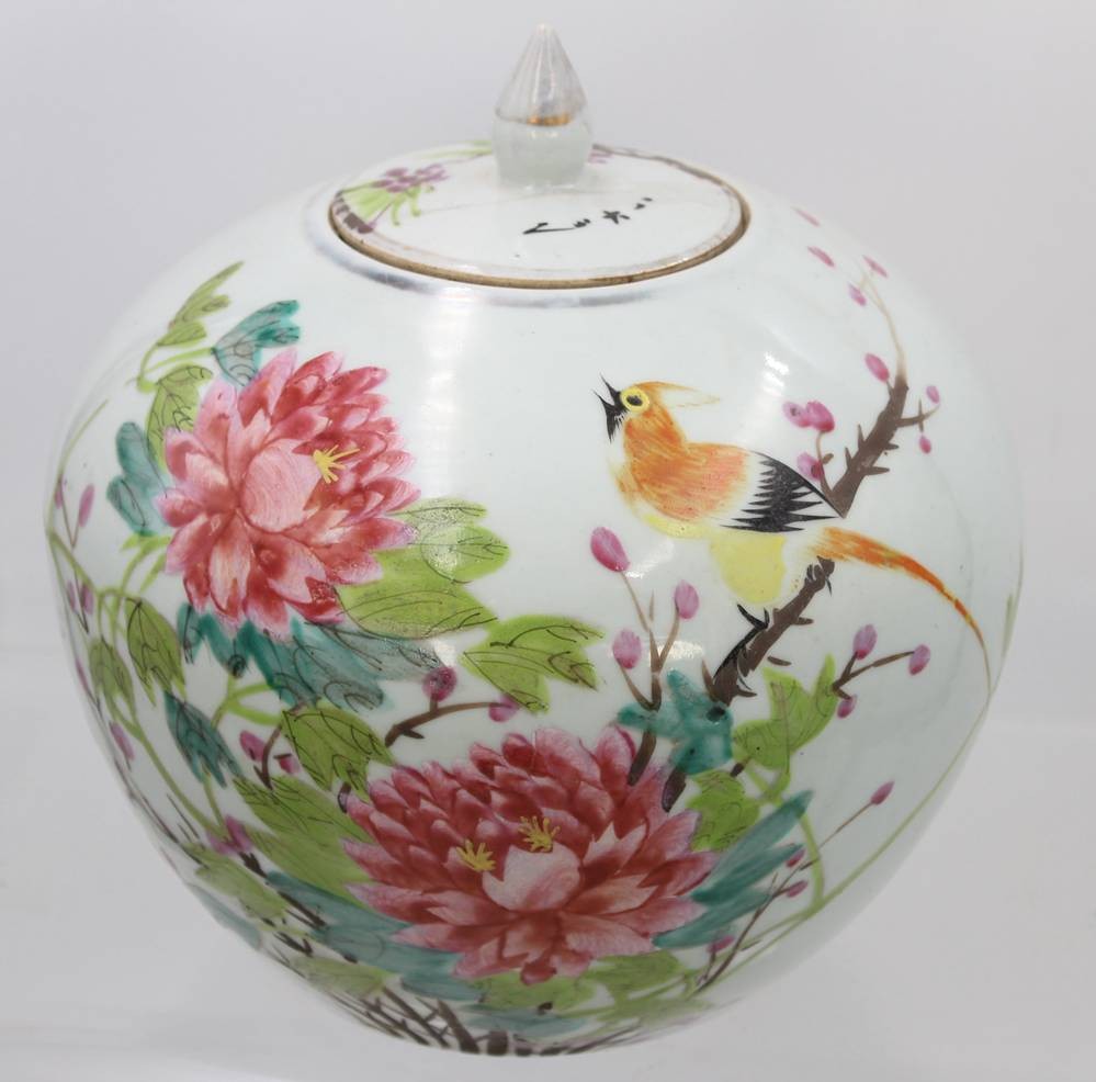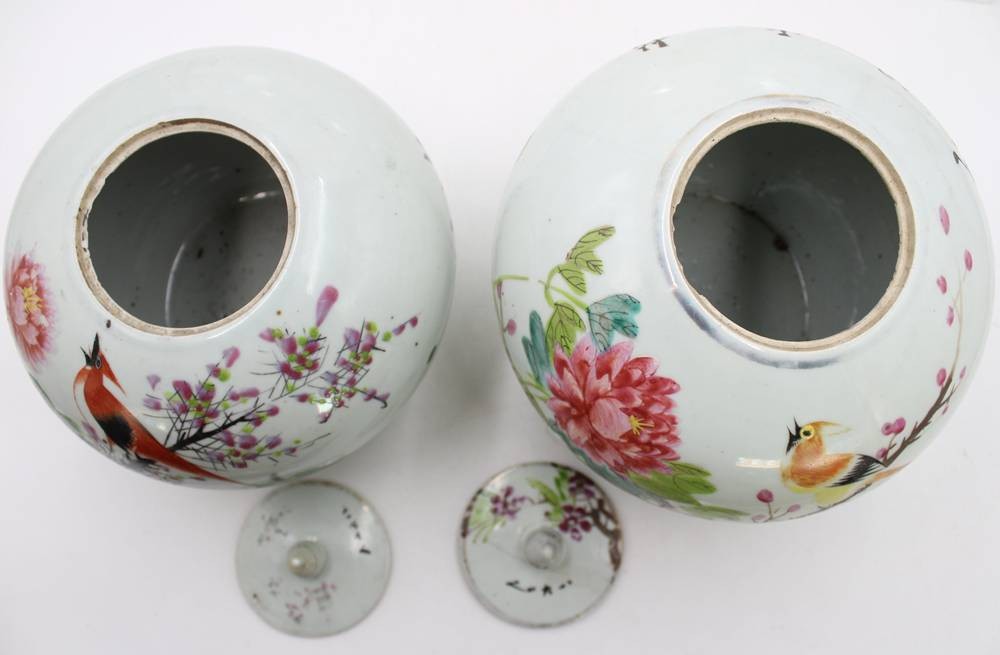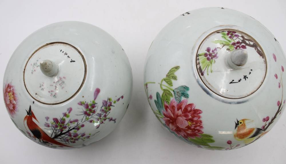 2x Ingwer-Töpfe, China, bemalt mit Vogel- und Blumenmotiven sowie Schriftzeichen, 1x Deckel geklebt und innen Rand bestossen, ca. H-20 bis 23cm [1]