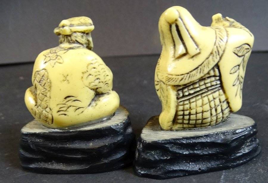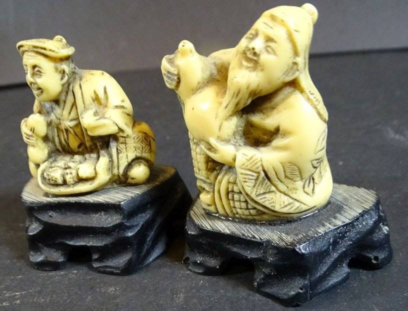 2x kl. Chinesen auf Holzsockel, H-5 cm, wohl Kunstmasse?
