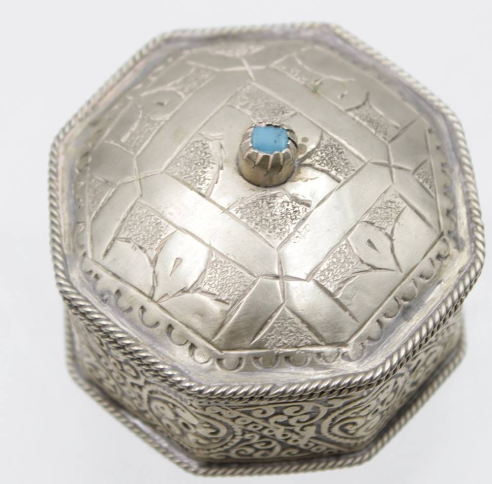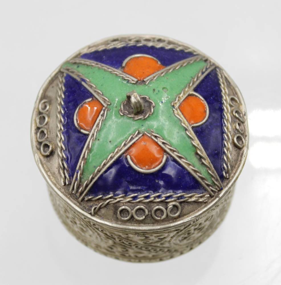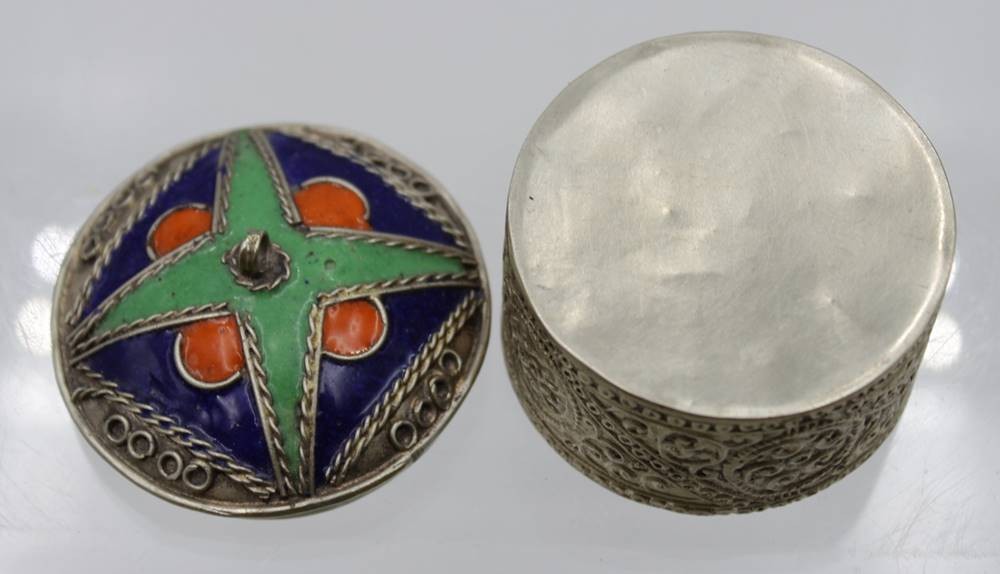 2x Zierdosen, wohl Indien, silberfarben, 1x emailliert, 1x besetzt mit türkisem Stein, ca. H-4c,m D-6,5cm. [1]