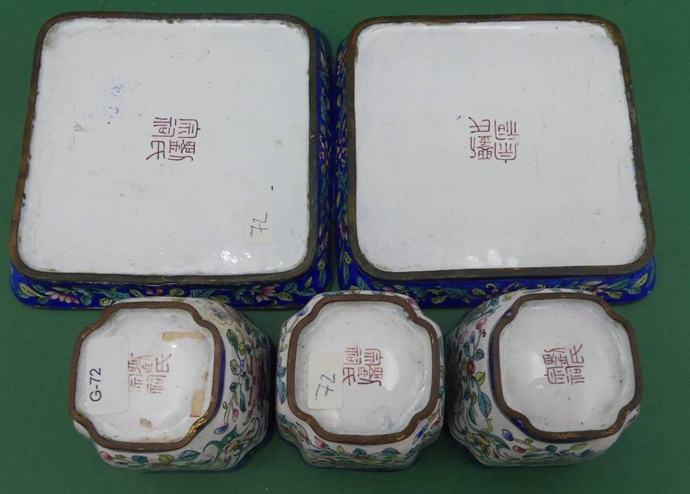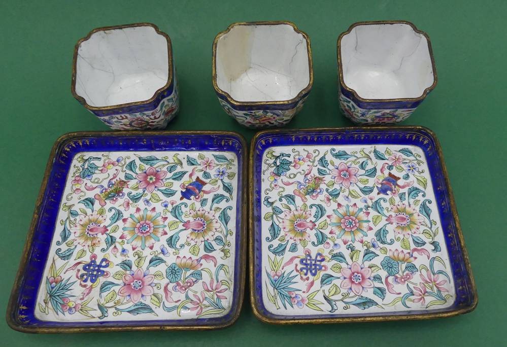 3 Koppchen (H-4 cm), 2 Tabletts (9,5x9,5 cm), Cloisonne, Altersspuren