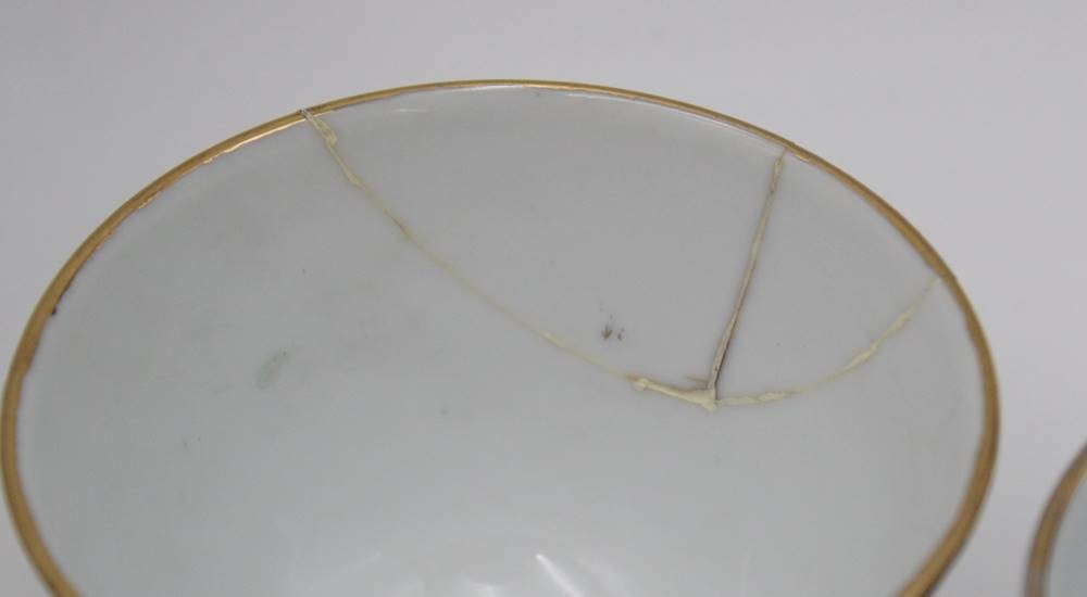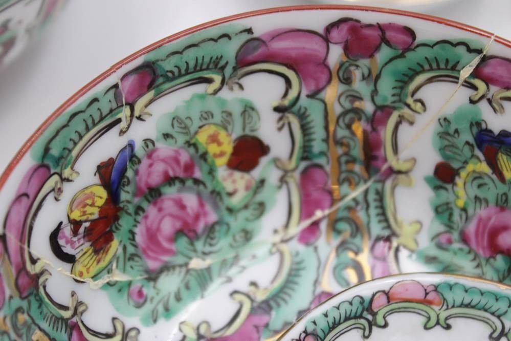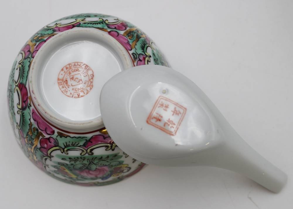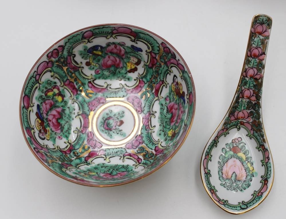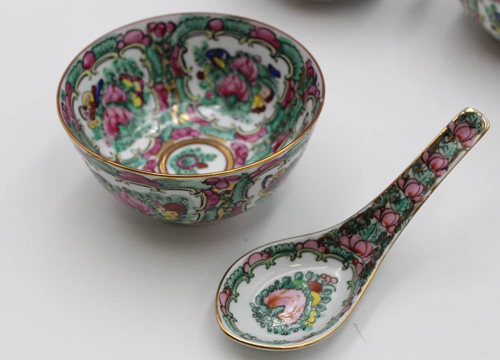 31tlg Porzellan-Konvolut, Japan, florale Bemalungen, runder Platte, 6x Suppenschalen (1x geklebt), 6x Löffel, 6x kl. Becher (1x geklebt), 6x Schalen (D-10cm) und 6x kl. Schälchen (D-7cm) [1]